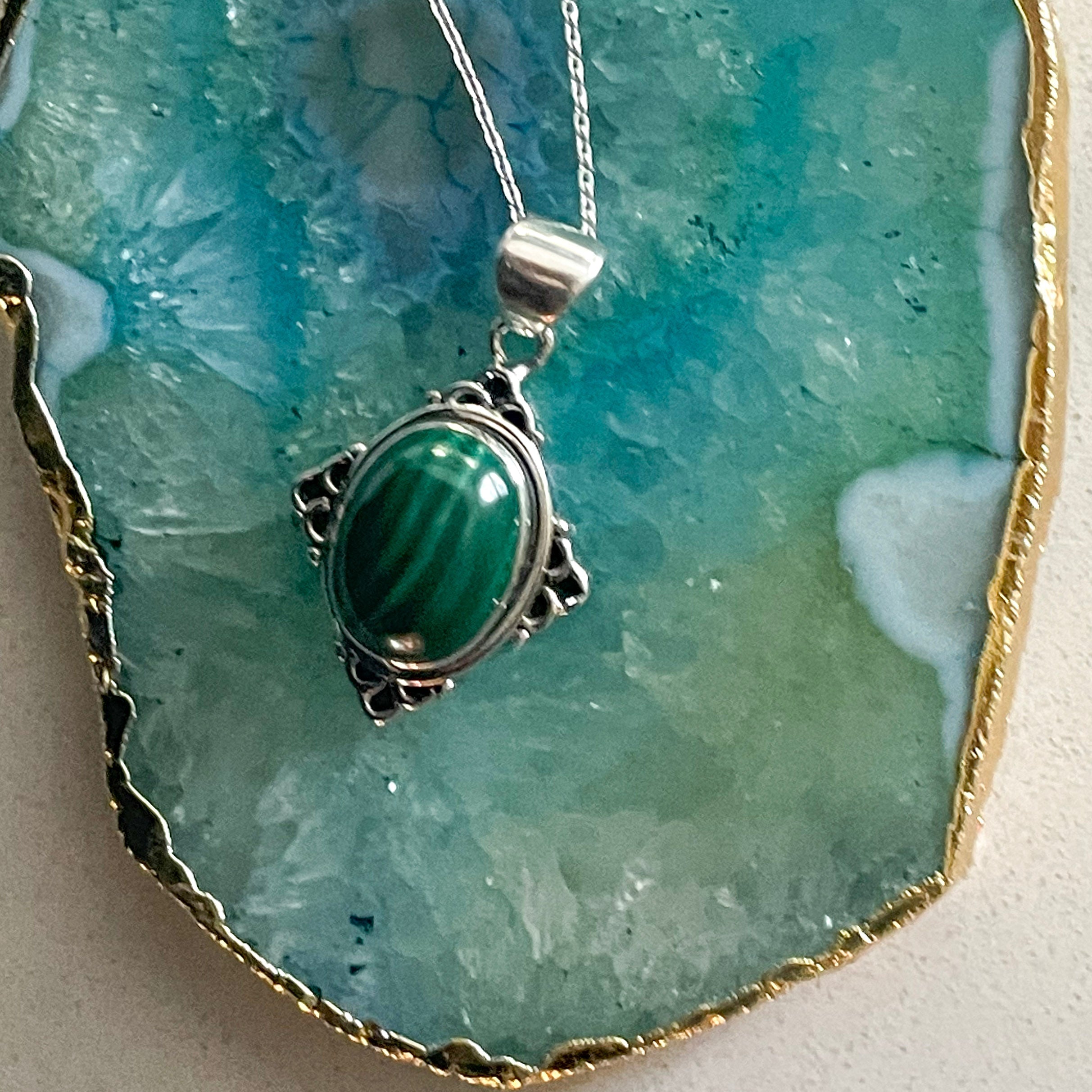 A Malachite pendant with contemporary design to adorn with any outfit. The color of the gemstone is of the peacock feather and adds beauty to the design with the carved hand crafted border in sterling silver. Very beautiful and mesmerizing with a minimalistic pattern