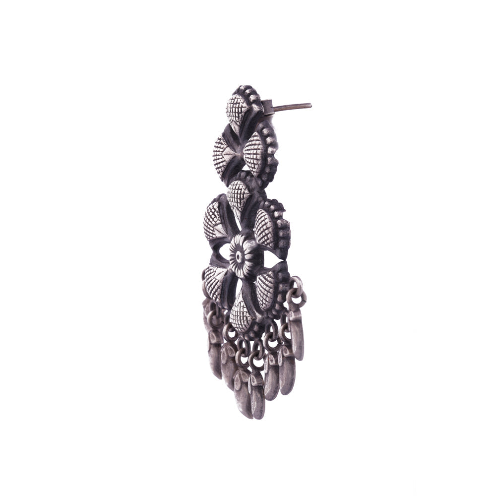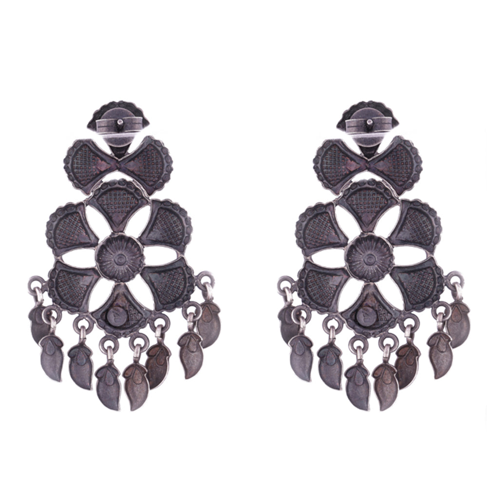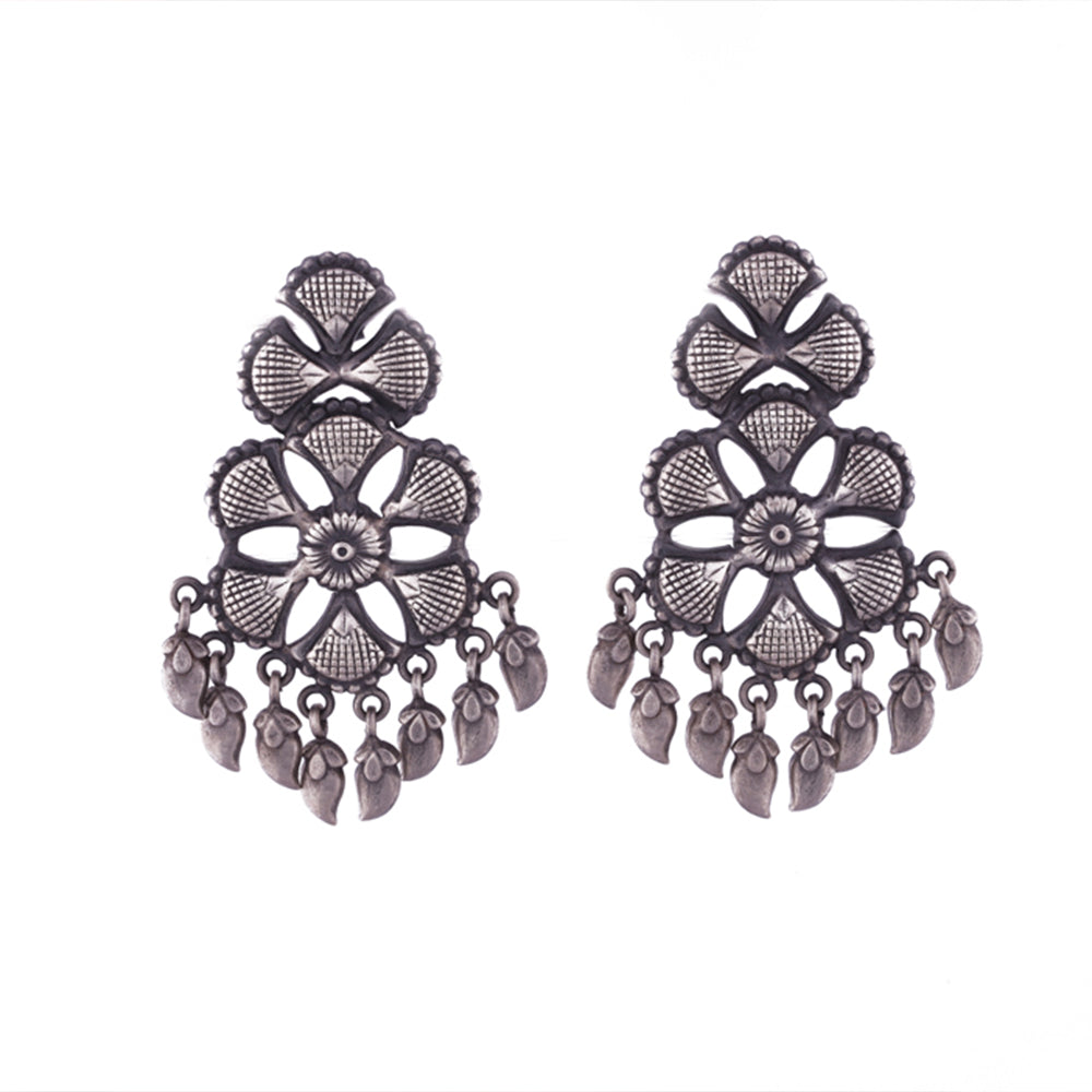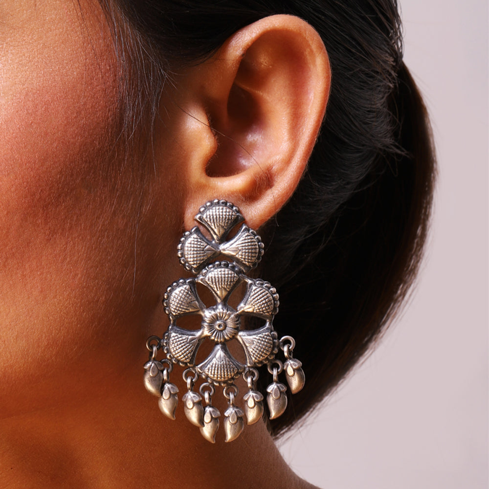 Traditional set of silver stud earrings with an exemplary flower and leaf design for the perfect look of cultural ethnicity. The design is inspired from the beautiful bird - the peacock and is marked with the magnificent ethereal beauty
