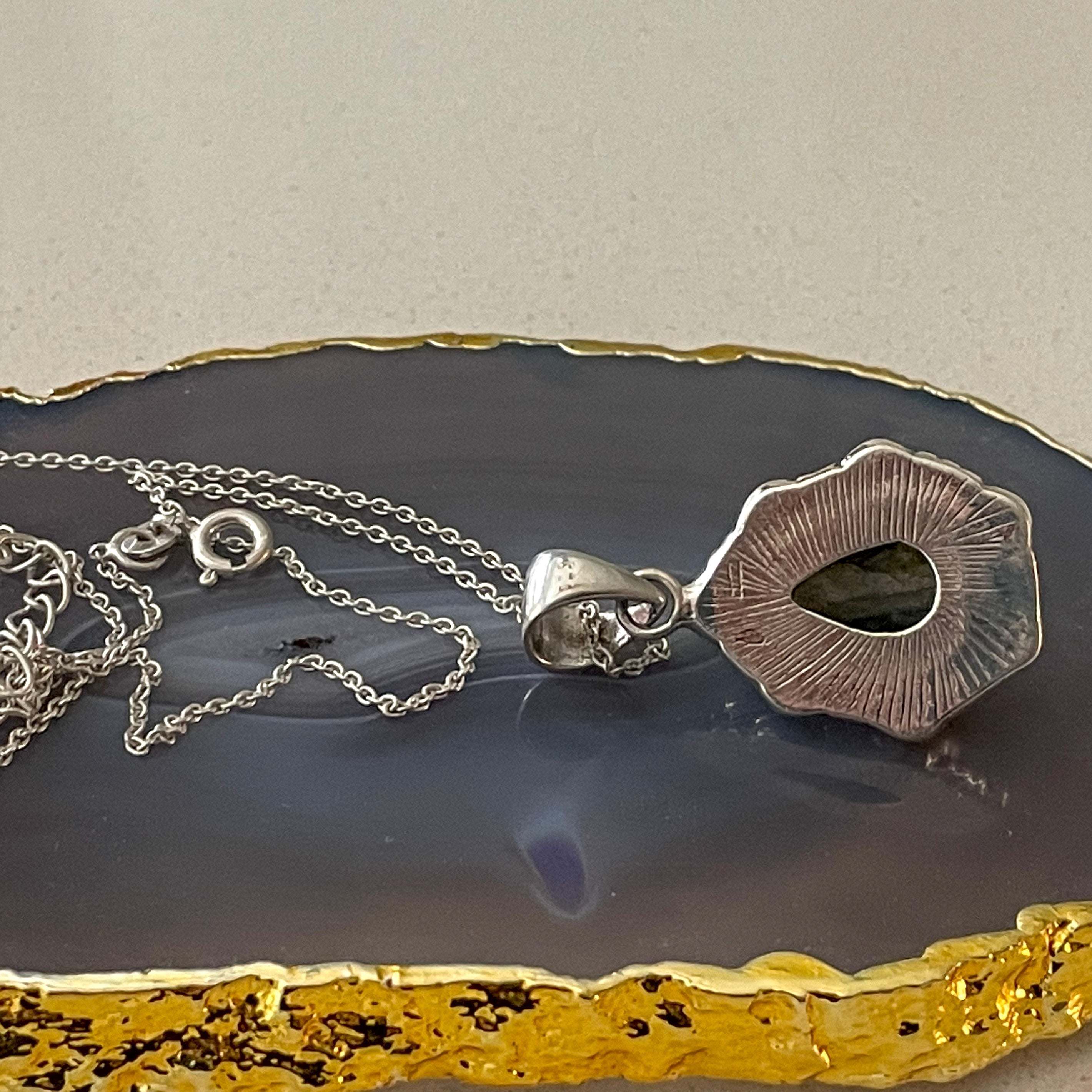 A mesmerizing Labtharorite pendant with prismatic sheen and class. Lovely intricate carving in Sterling Silver