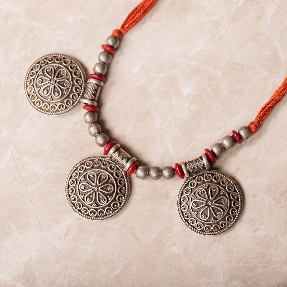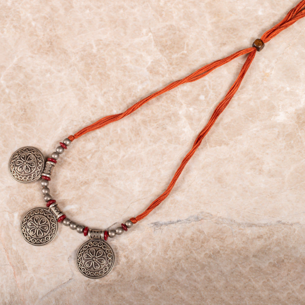 A traditional necklace which is always loved to be adorned with any kid of attire or color. A touch of ethic look, a touch of contemporary style and a touch of class and elegance is what this necklace is all about. It is light weight with a orange string tie up with a beautiful choker design