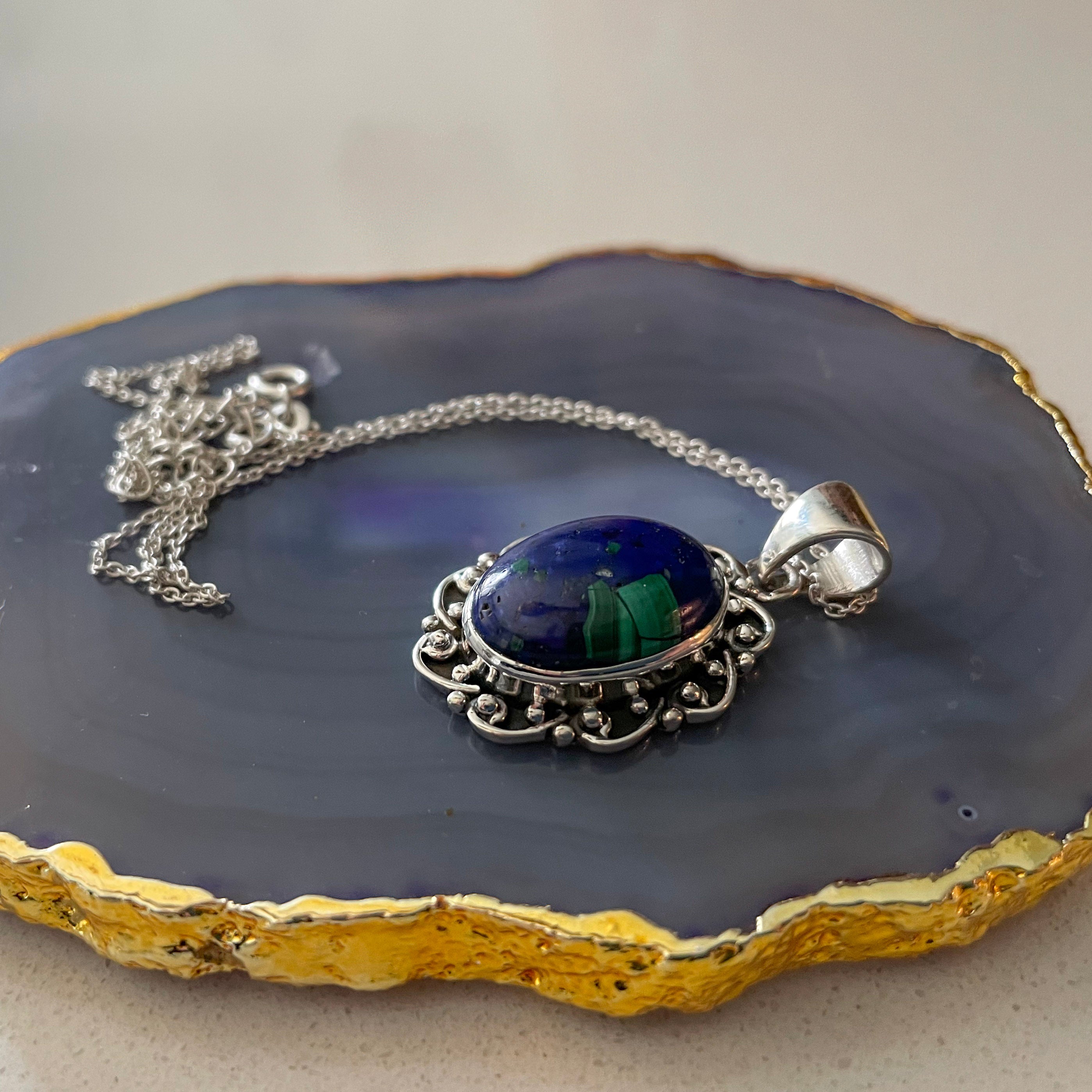 A stylish and flawless pendant with an ethnic carving and flawless matrix of blue and green Azurite malachite. The colors of the gemstone is of the peacock feather and adds beauty to the design with the carved hand crafted border in sterling silver. Very beautiful and mesmerizing
