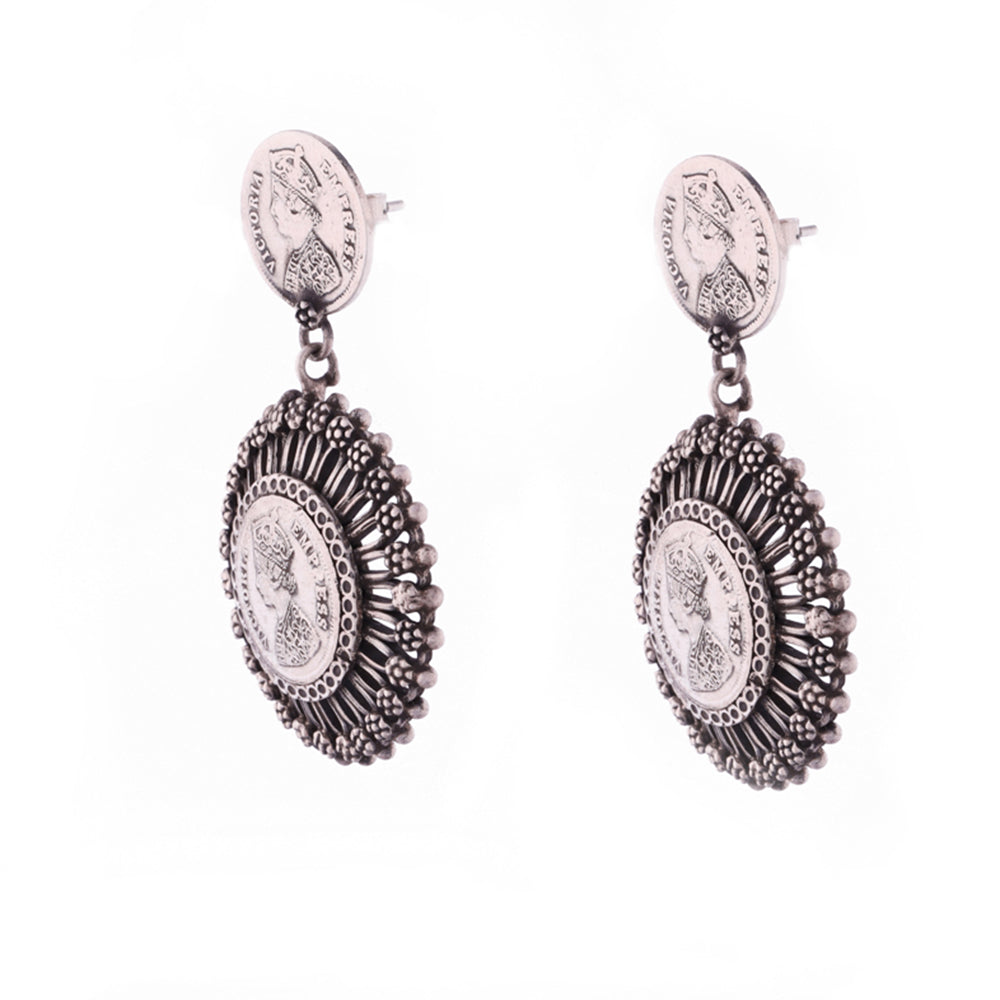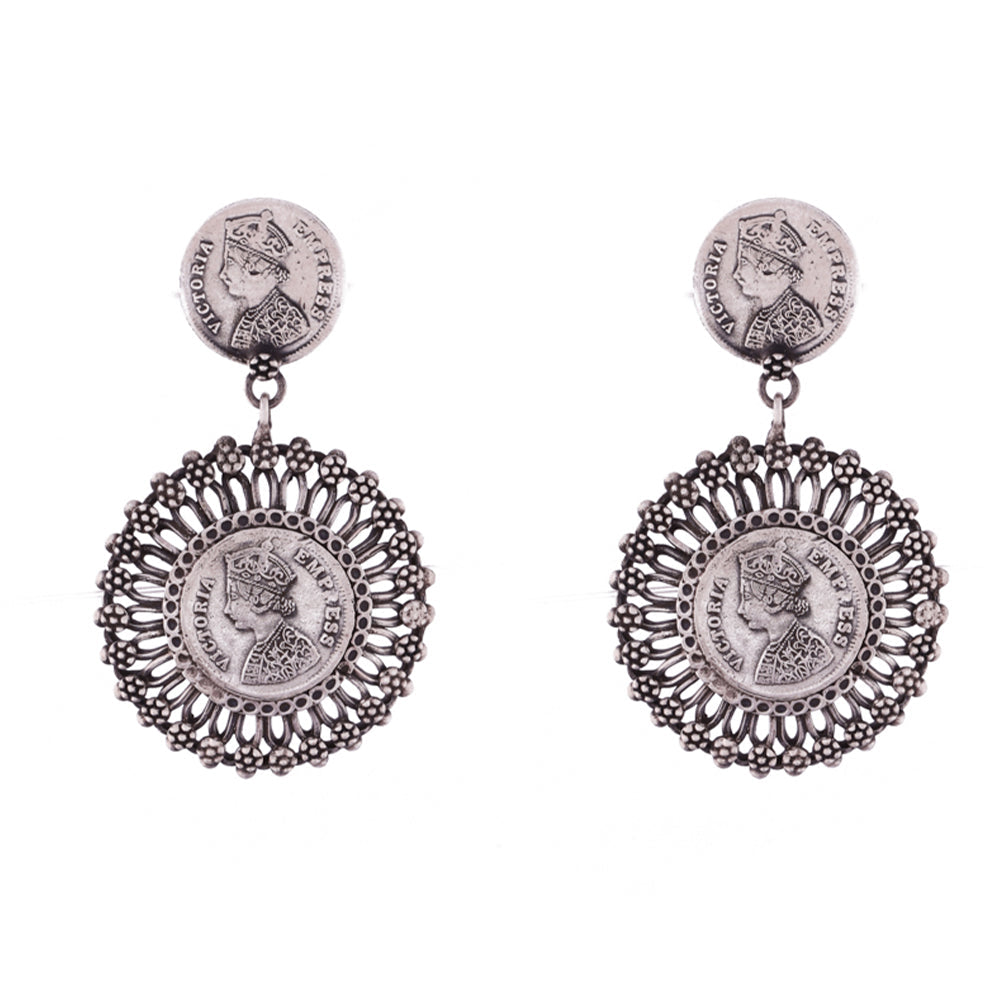 Terrifically designed ethnic set of silver drop earrings with a meticulously designed engraving of Queen Victoria.