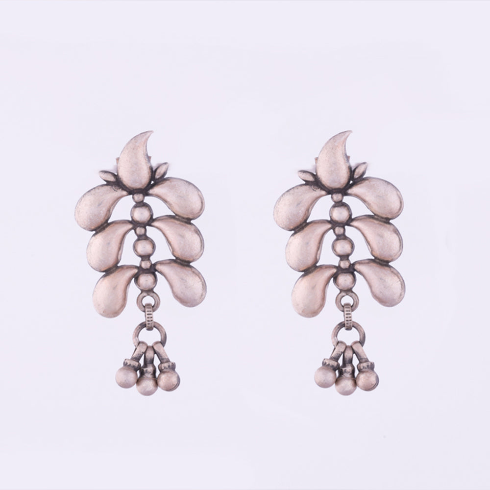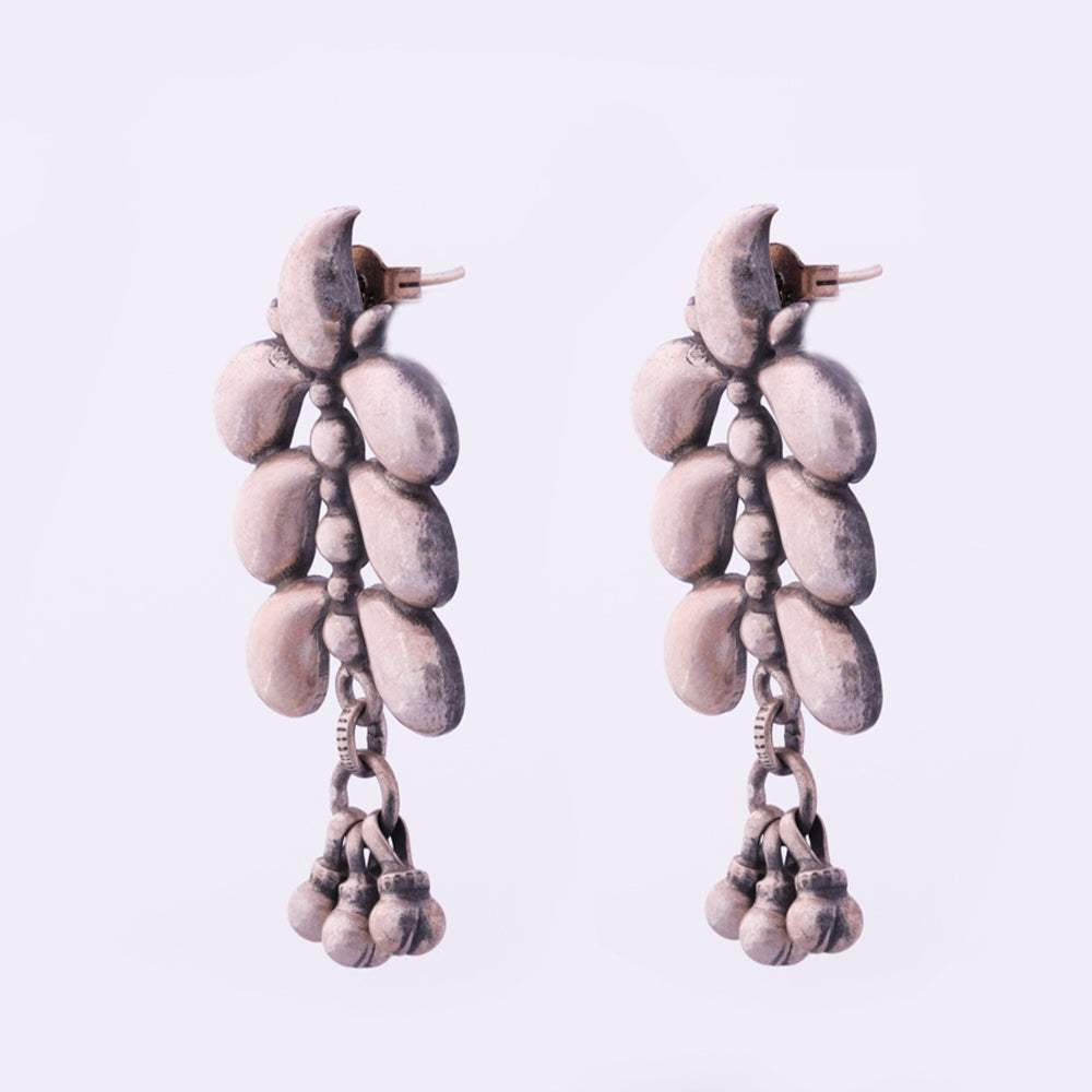 Brilliantly rustic silver earrings in ornate silvery water droplets pattern. Inspired by the multiple feathers of the peacock, these are a set of beautiful hand crafted earrings in silver.