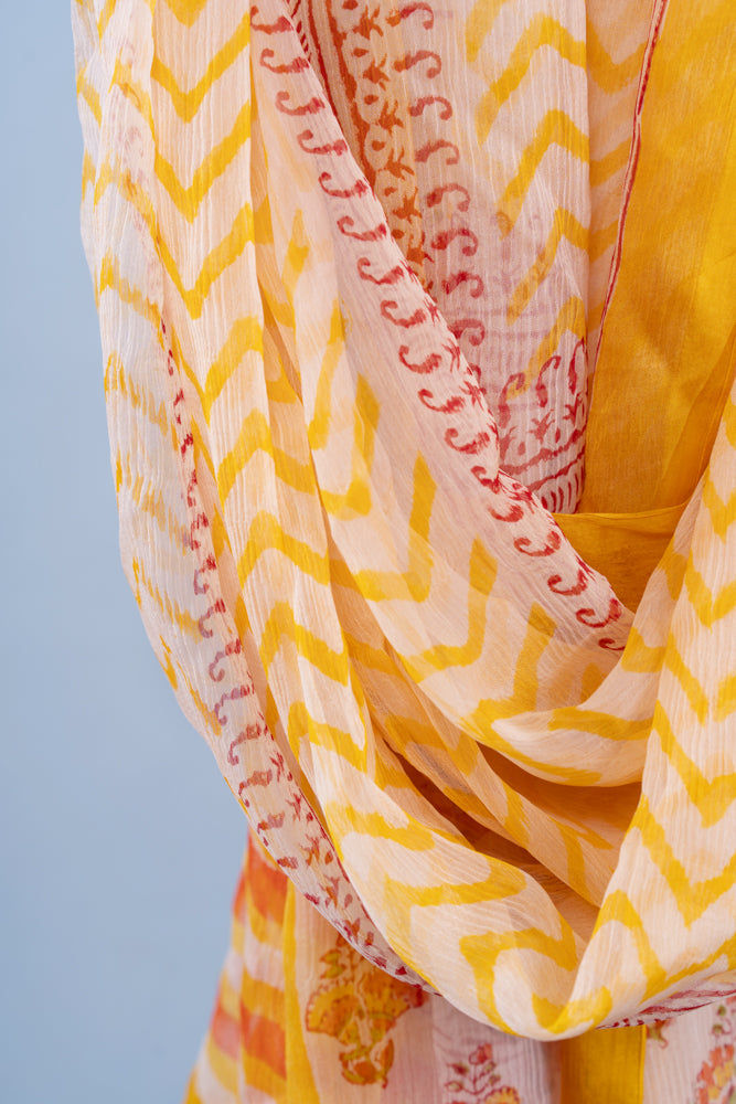 This chevron dupatta with a floral border is made with the finest quality and is hand block printed. With a bright sunshine yellow color base and multi colored bright floral print, it looks beautiful on your shoulders while you go out. The dupatta can be worn with jeans, a suit or a casual outfit. With this kind of quality and design, you will have a good time at any occasion.