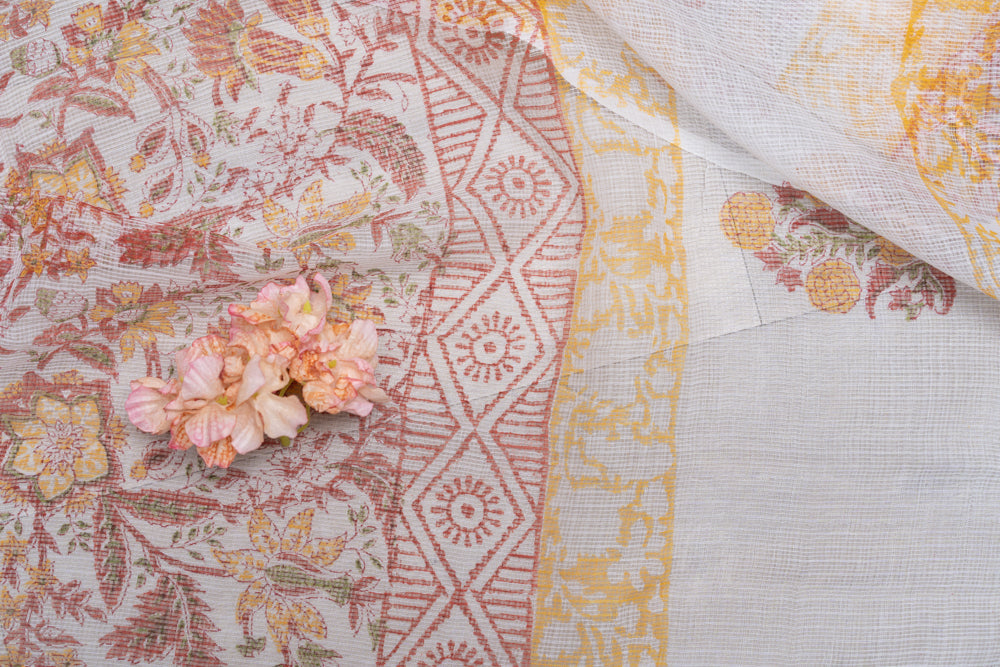 OMVAI Flower Jaal Hand Block Printed Kota Doria Checks Stole / Dupatta - White Red