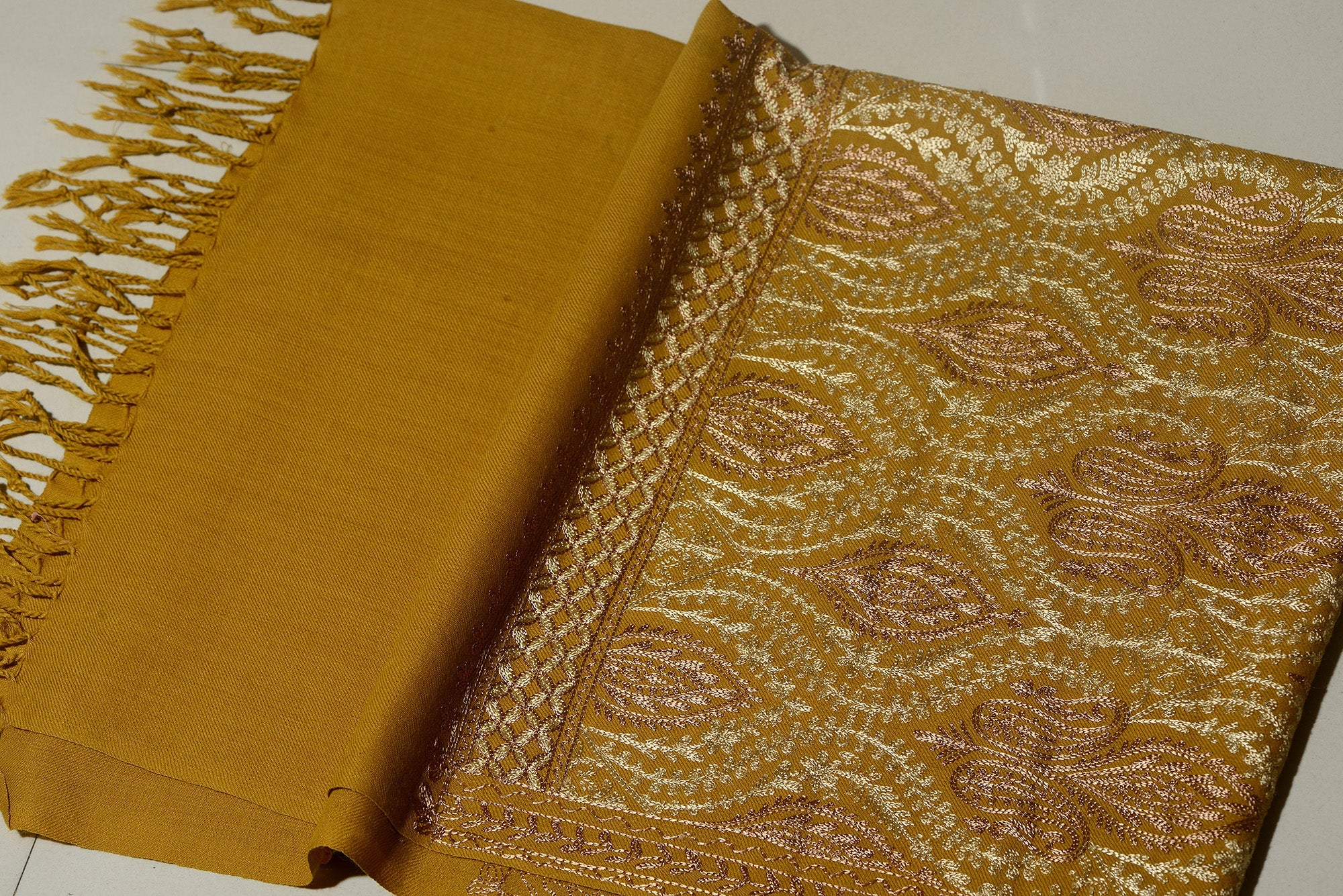IKSHA means beautiful and attractive. It is an Elegant Mustard Yellow Embroidered shawl, both for men and women, with all over intricate embroidery using silk threads. The intricate pattern makes the pashmina look very graceful and opulent.