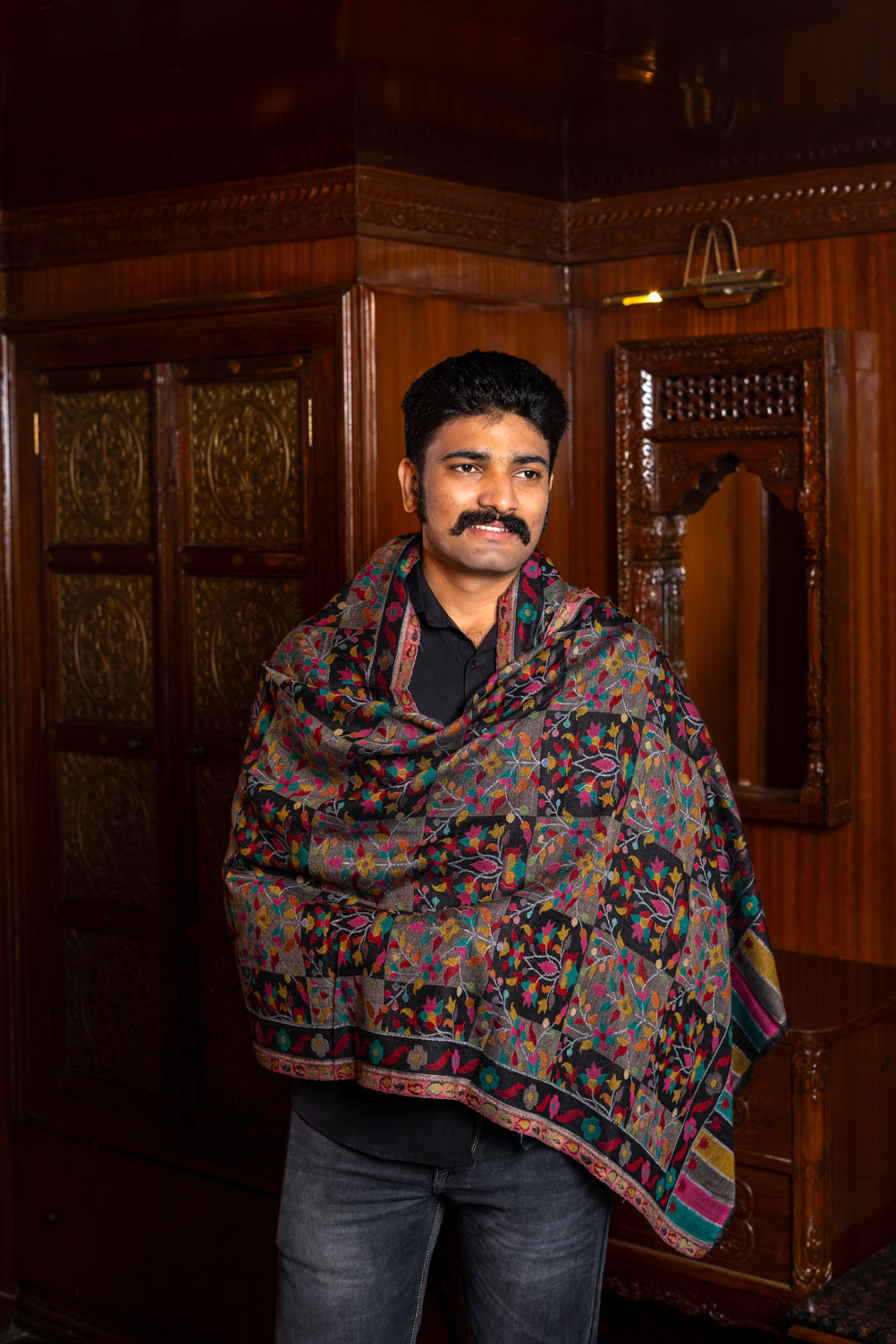 The traditional name for this variety of shawls is" Kani" and is very famous from the lands of Kashmir. Kani is generally an array of beautiful patterns woven using bright colors with a multi colored striped edges. This particular shawl is made in wool, but is not hand woven. It is machine woven to give the Kani look. The original Kani is much more lighter, softer to feel and more luxurious.