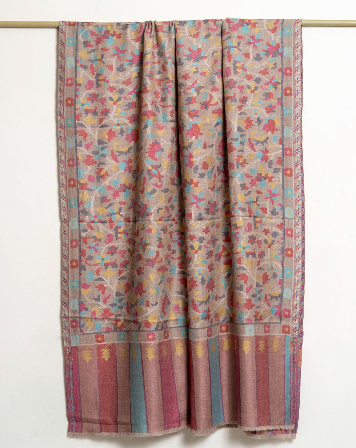 The traditional name for this variety of shawls is" Kani" and is very famous from the lands of Kashmir. Kani is generally an array of beautiful patterns woven using bright colors with a multi colored striped edges. This particular shawl is made in wool, but is not hand woven. It is machine woven to give the Kani look. The original Kani is much more lighter, softer to feel and more luxurious.