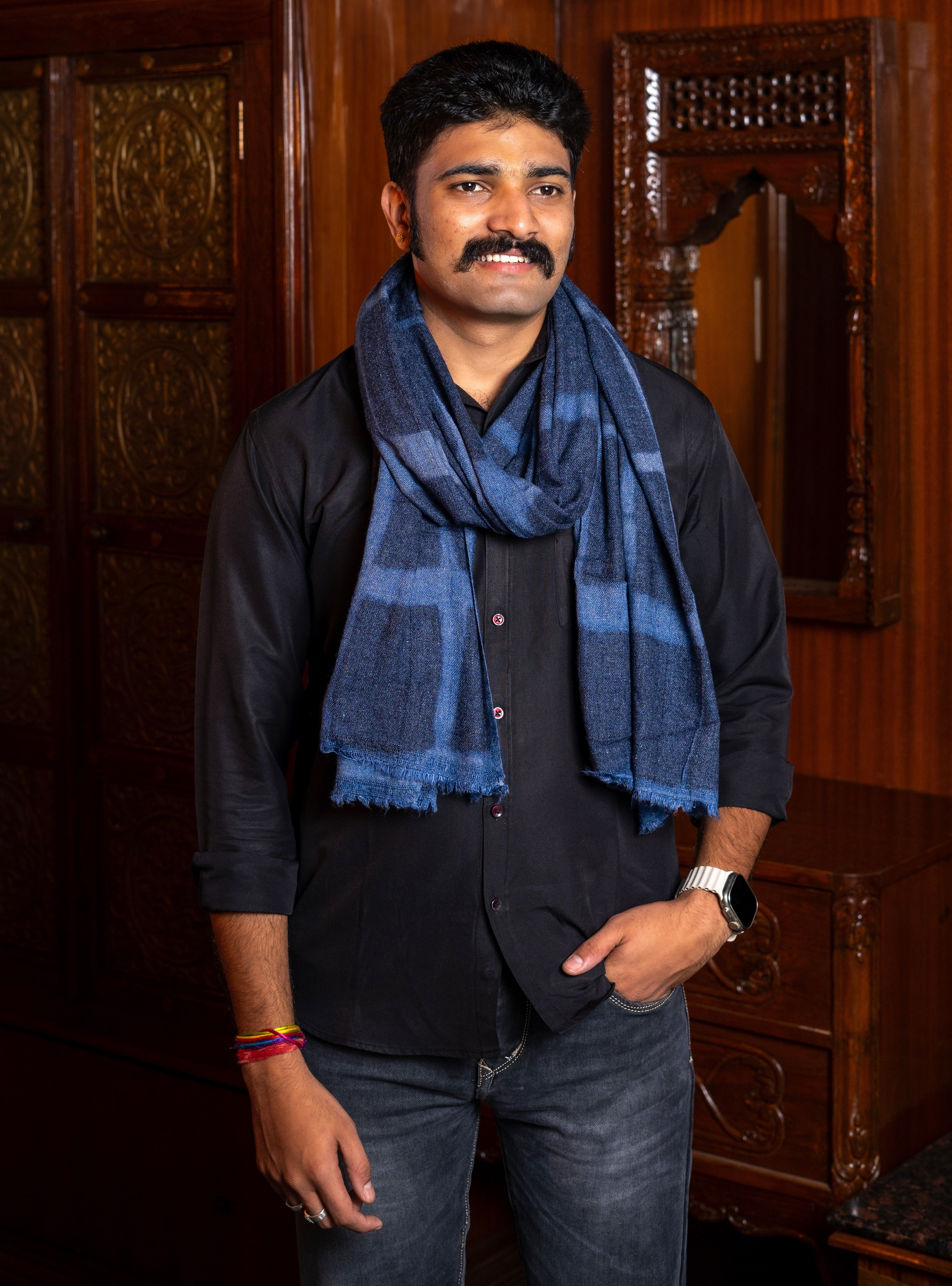 OMVAI presents to you the range of beautiful mufflers which can be used by men and women too. These are made from the finest wool and are stylish, elegant with tie and dye printing in lovely blue tones. This is printed using the traditional tie and dye printing technique using AZO free dyes, which are hypo-allergic, eco-friendly, and non-toxic to the environment.