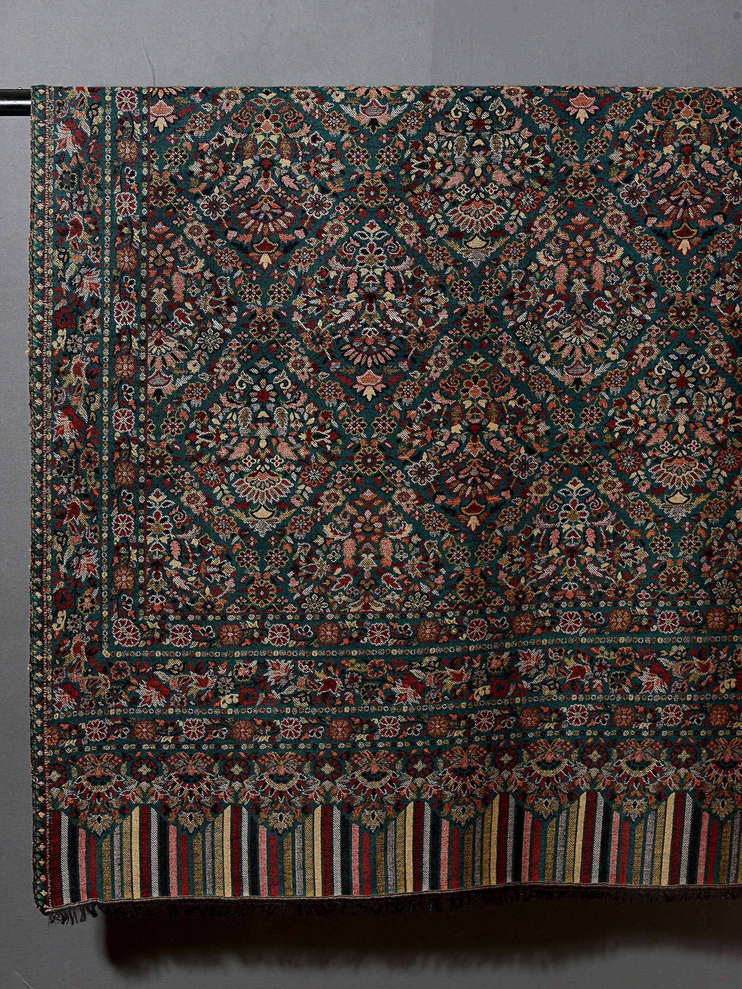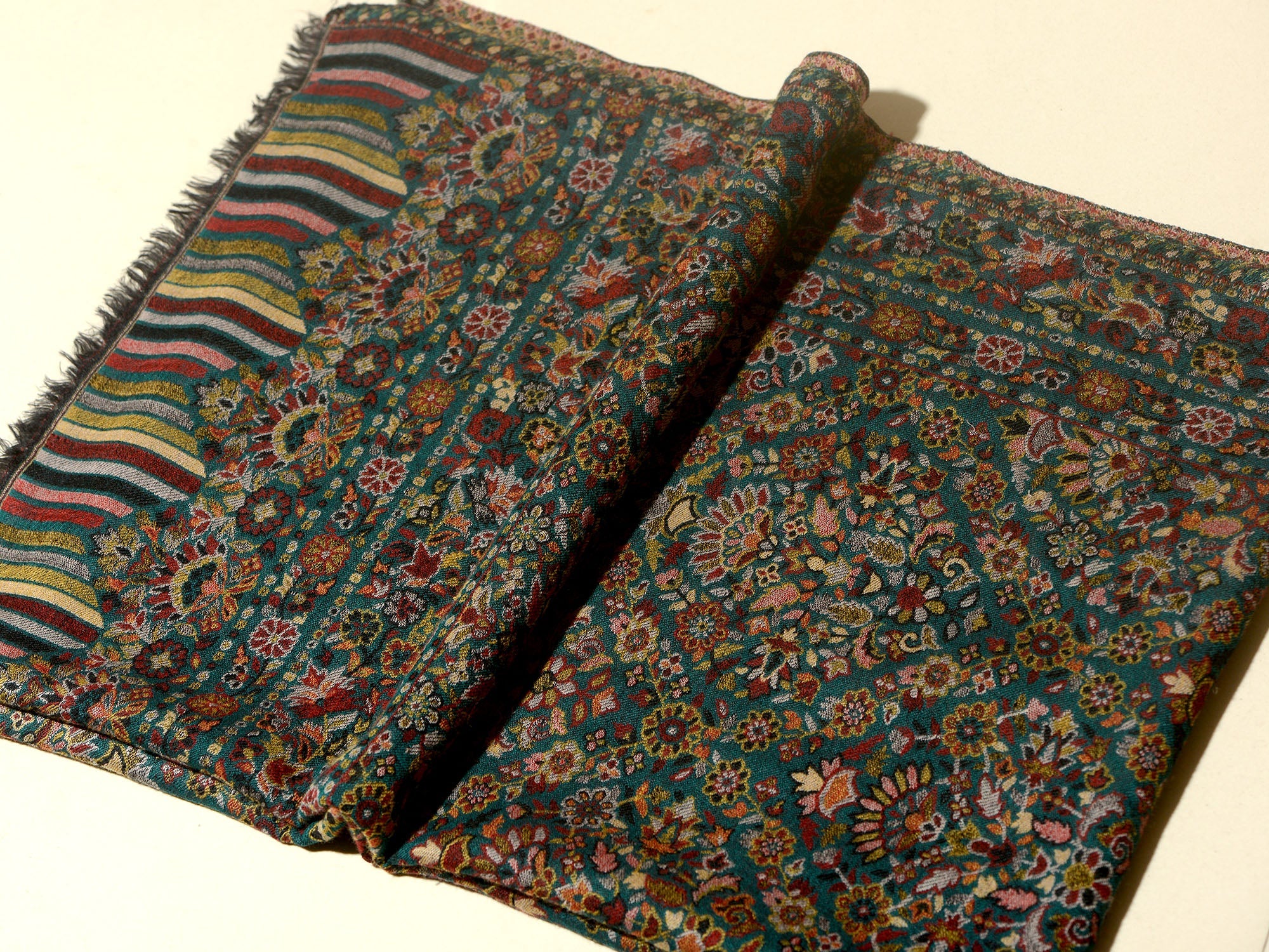 The traditional name for this variety of shawls is" Kani" and is very famous from the lands of Kashmir. Kani is generally an array of beautiful patterns woven using bright colors with a multi colored striped edges. This particular shawl is made in wool, but is not hand woven. It is machine woven to give the Kani look. The original Kani is much more lighter, softer to feel and more luxurious.