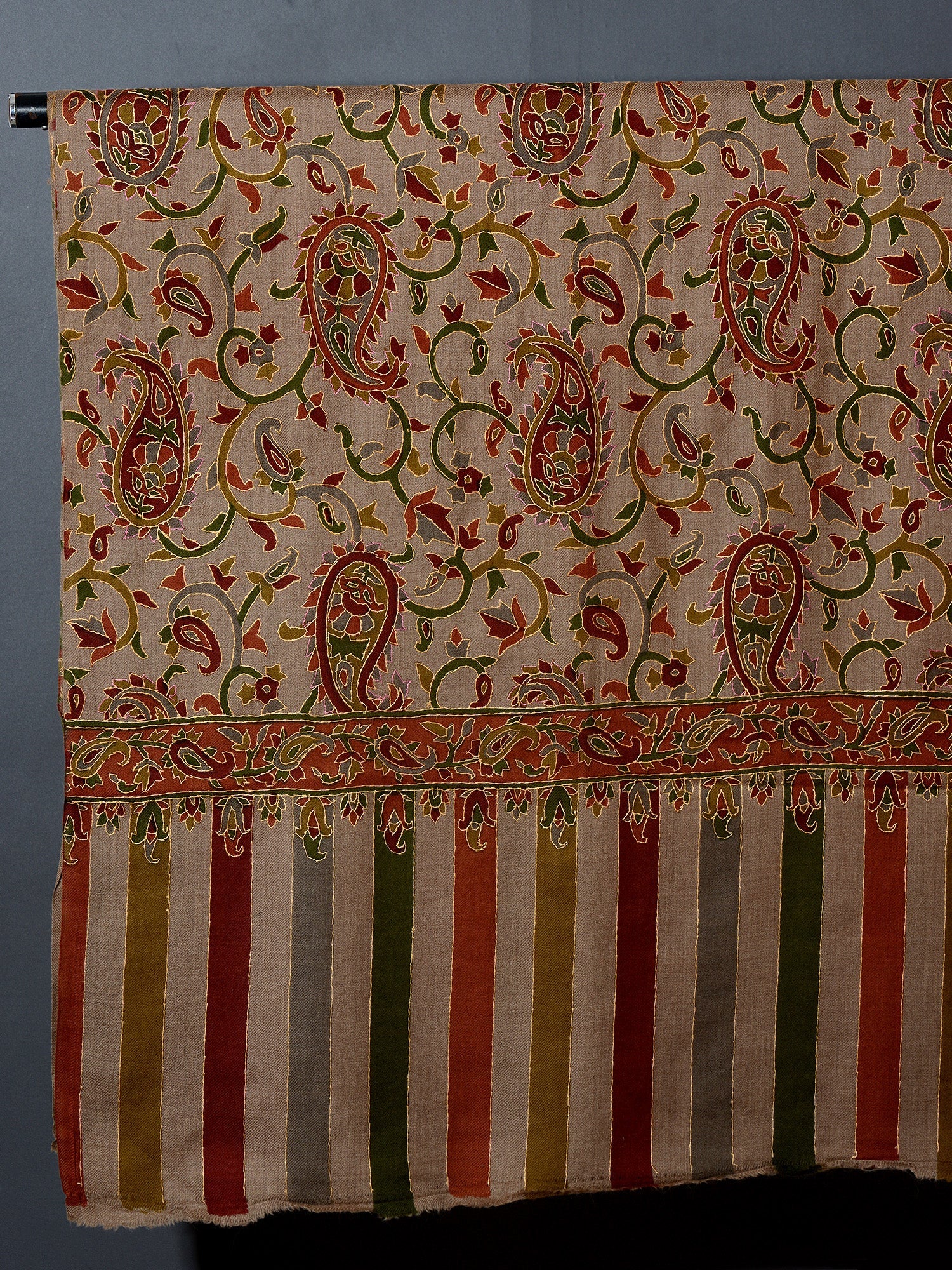 The traditional name for this variety of shawls is" Kani" and is very famous from the lands of Kashmir. Kani is generally an array of beautiful patterns woven using bright colors with a multi colored striped edges. This particular shawl is made in wool, but is not hand woven. It is machine woven to give the Kani look. The original Kani is much more lighter, softer to feel and more luxurious.