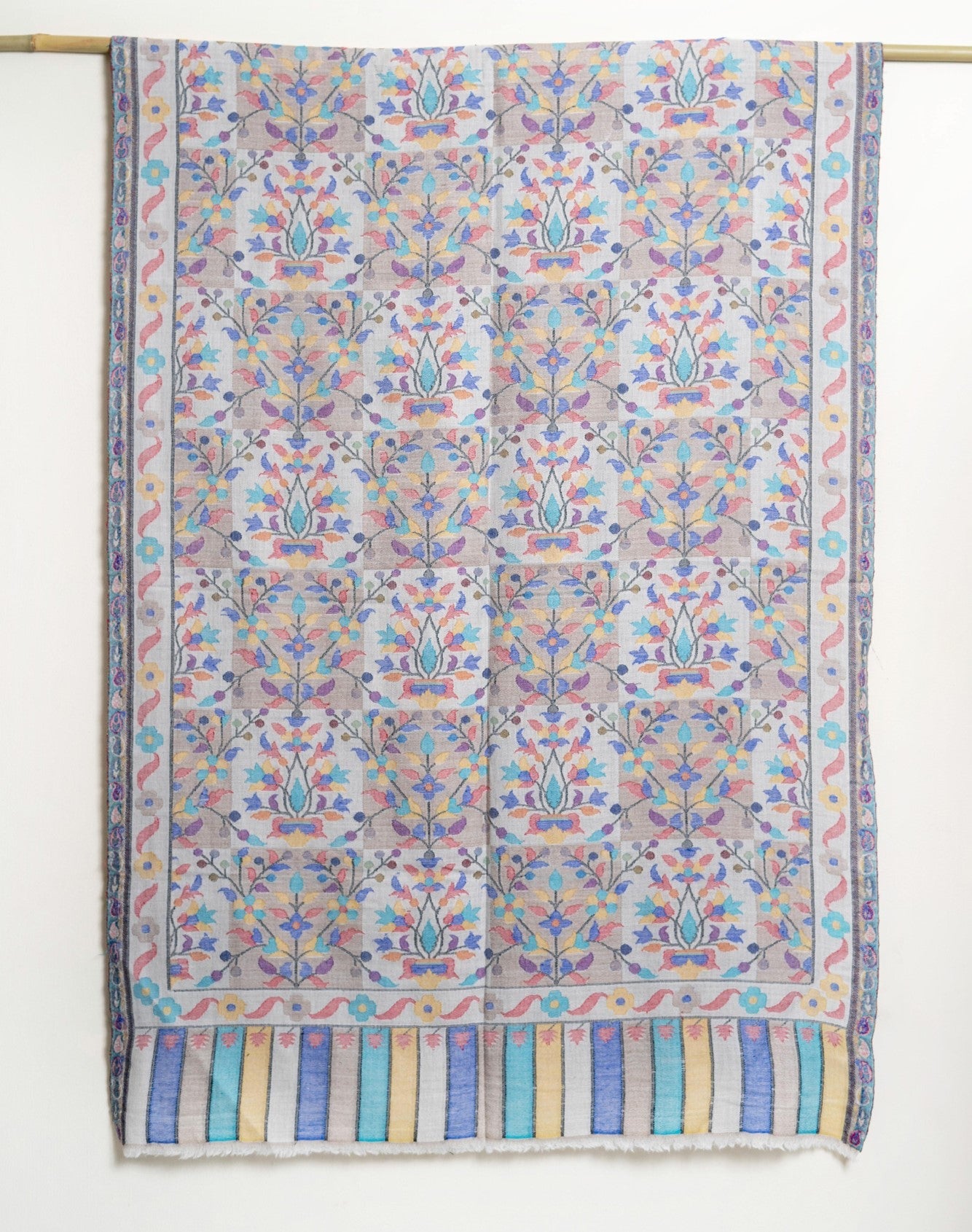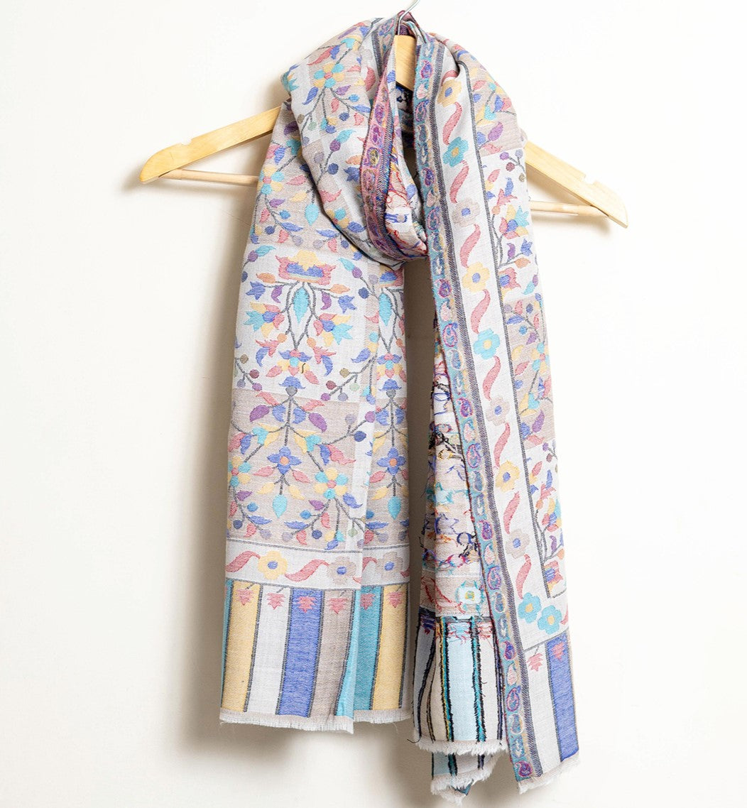 The traditional name for this variety of shawls is" Kani" and is very famous from the lands of Kashmir. Kani is generally an array of beautiful patterns woven using bright colors with a multi colored striped edges. This particular shawl is made in wool, but is not hand woven. It is machine woven to give the Kani look. The original Kani is much more lighter, softer to feel and more luxurious.