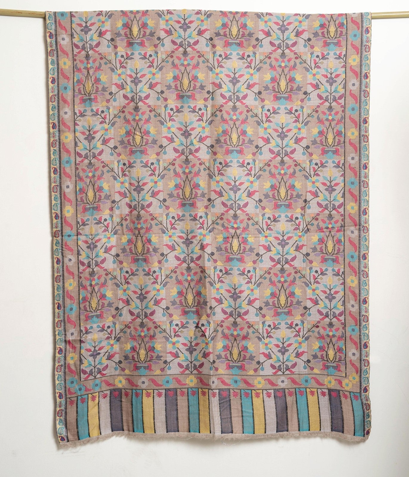 The traditional name for this variety of shawls is" Kani" and is very famous from the lands of Kashmir. Kani is generally an array of beautiful patterns woven using bright colors with a multi colored striped edges. This particular shawl is made in wool, but is not hand woven. It is machine woven to give the Kani look. The original Kani is much more lighter, softer to feel and more luxurious.
