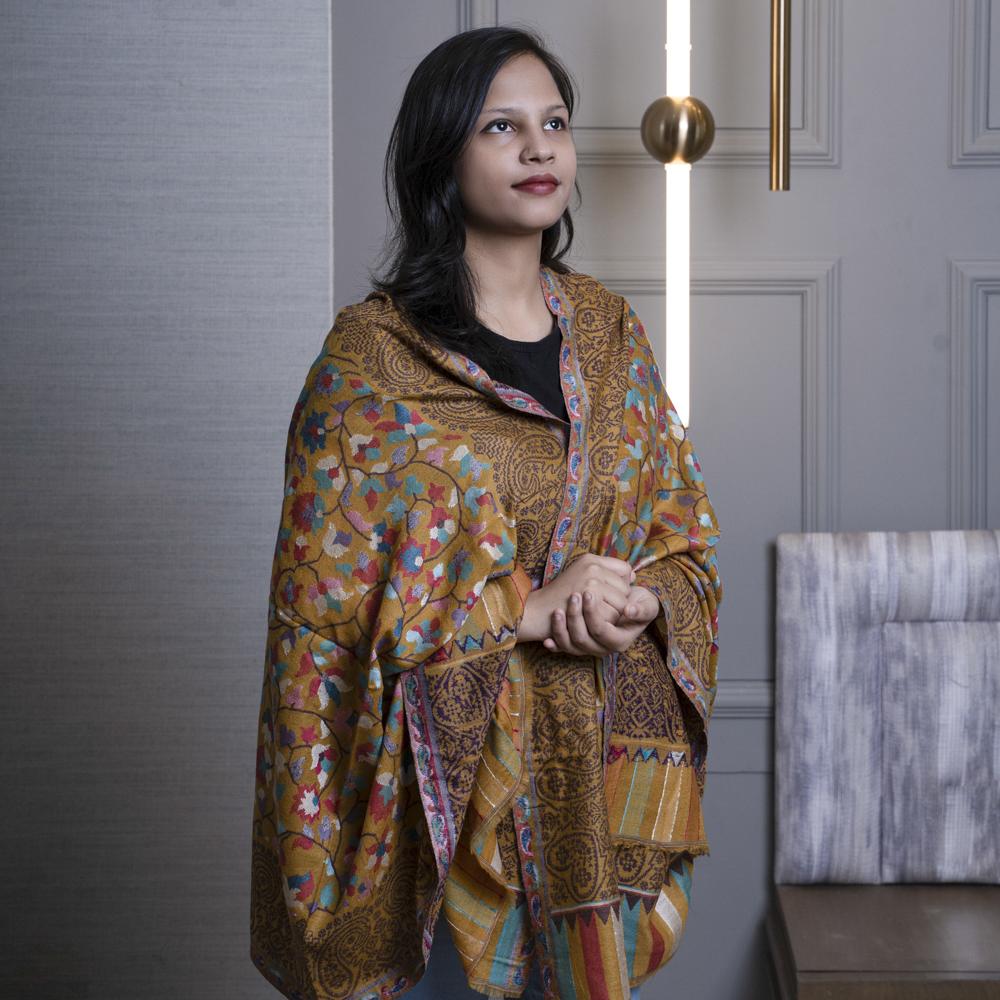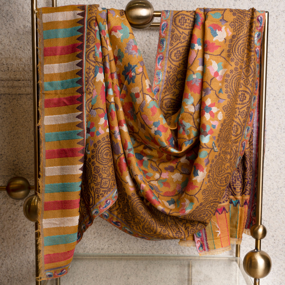 Firasah means Insights of God and this kani shawl is indeed a beautiful yellow woven shawl, both for men and women. It has an all over intricate weaving using bright colors and a border in coffee brown to add the richness.