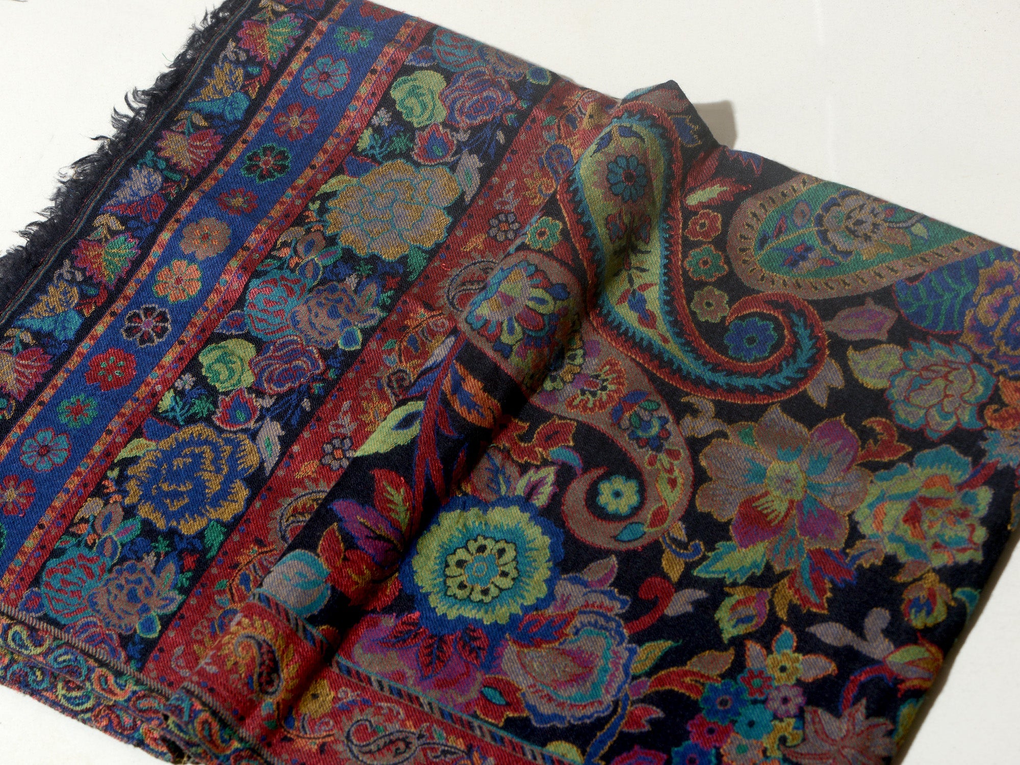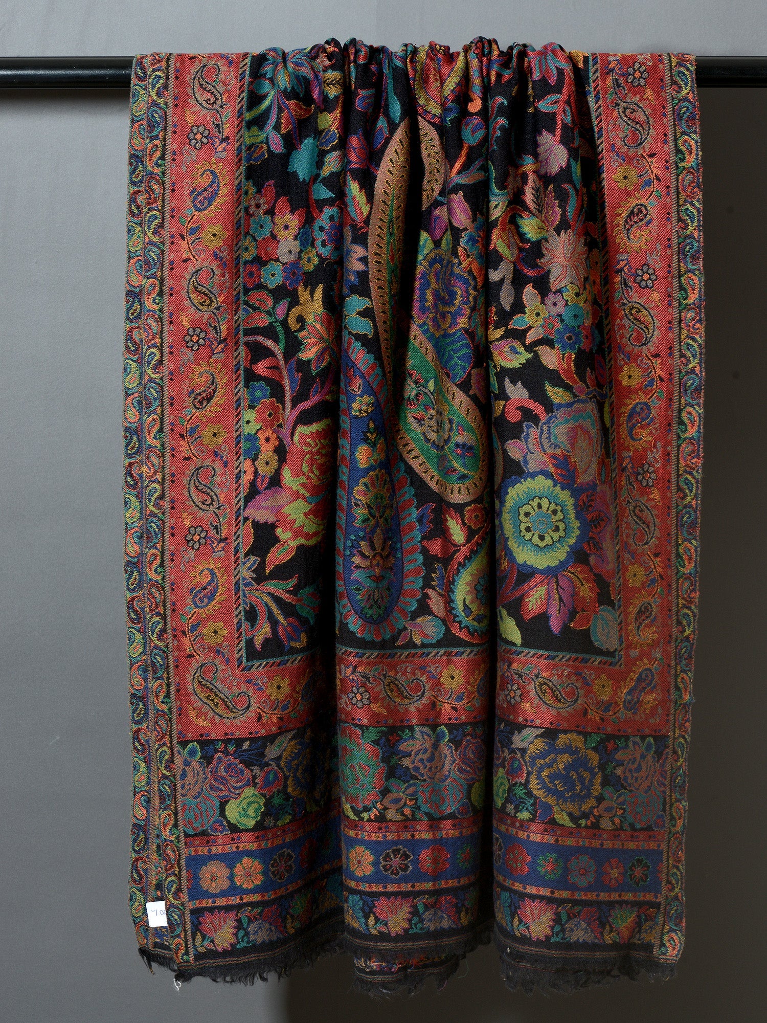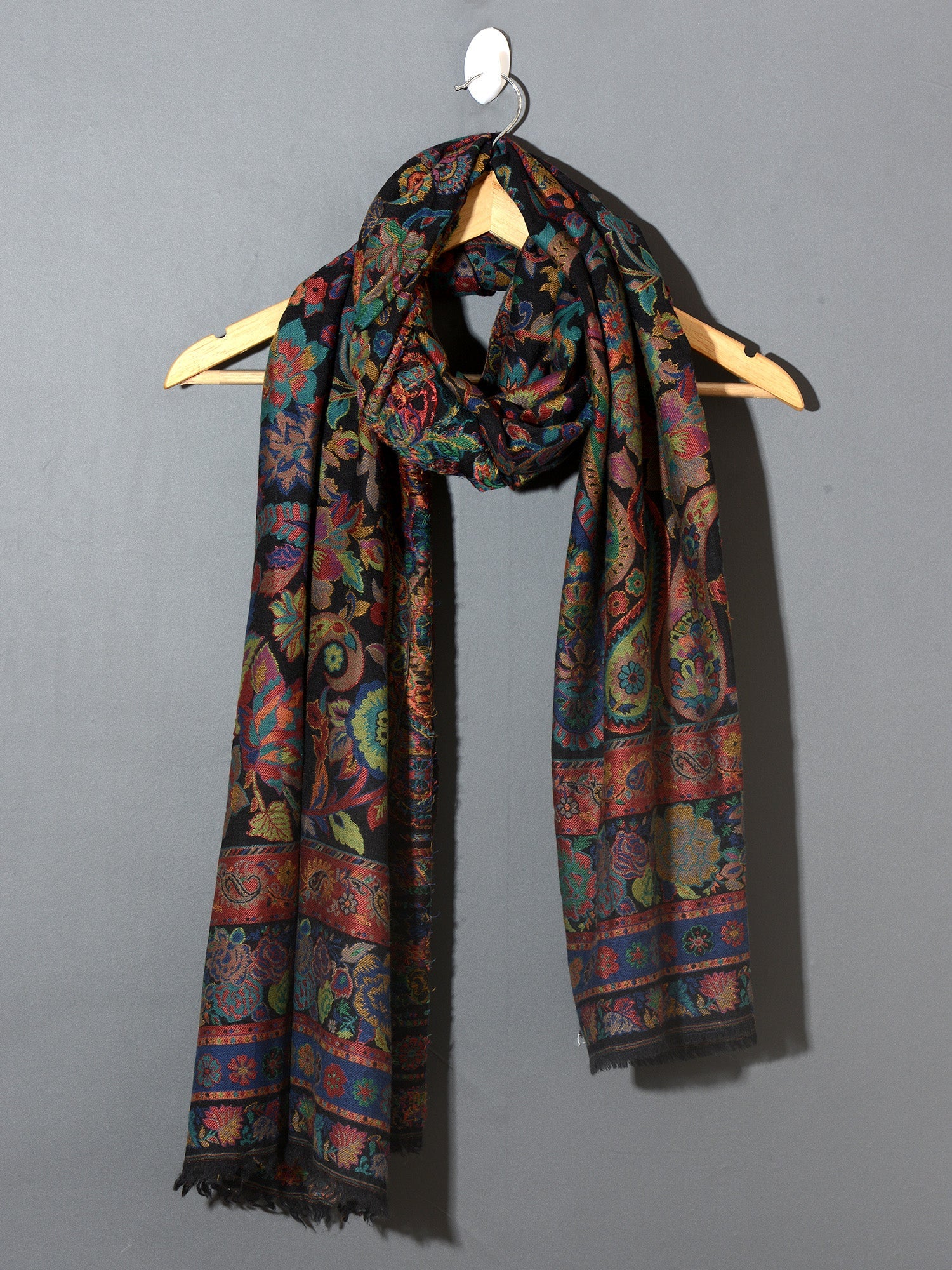 The traditional name for this variety of shawls is" Kani" and is very famous from the lands of Kashmir. Kani is generally an array of beautiful patterns woven using bright colors with a multi colored striped edges. This particular shawl is made in wool, but is not hand woven. It is machine woven to give the Kani look. The original Kani is much more lighter, softer to feel and more luxurious.