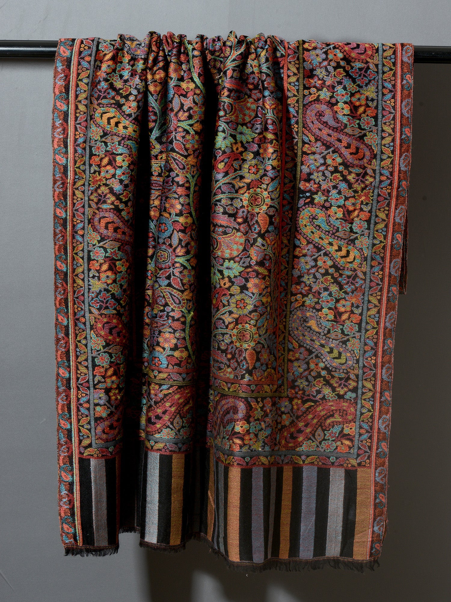 The traditional name for this variety of shawls is" Kani" and is very famous from the lands of Kashmir. Kani is generally an array of beautiful patterns woven using bright colors with a multi colored striped edges. This particular shawl is made in wool, but is not hand woven. It is machine woven to give the Kani look. The original Kani is much more lighter, softer to feel and more luxurious.