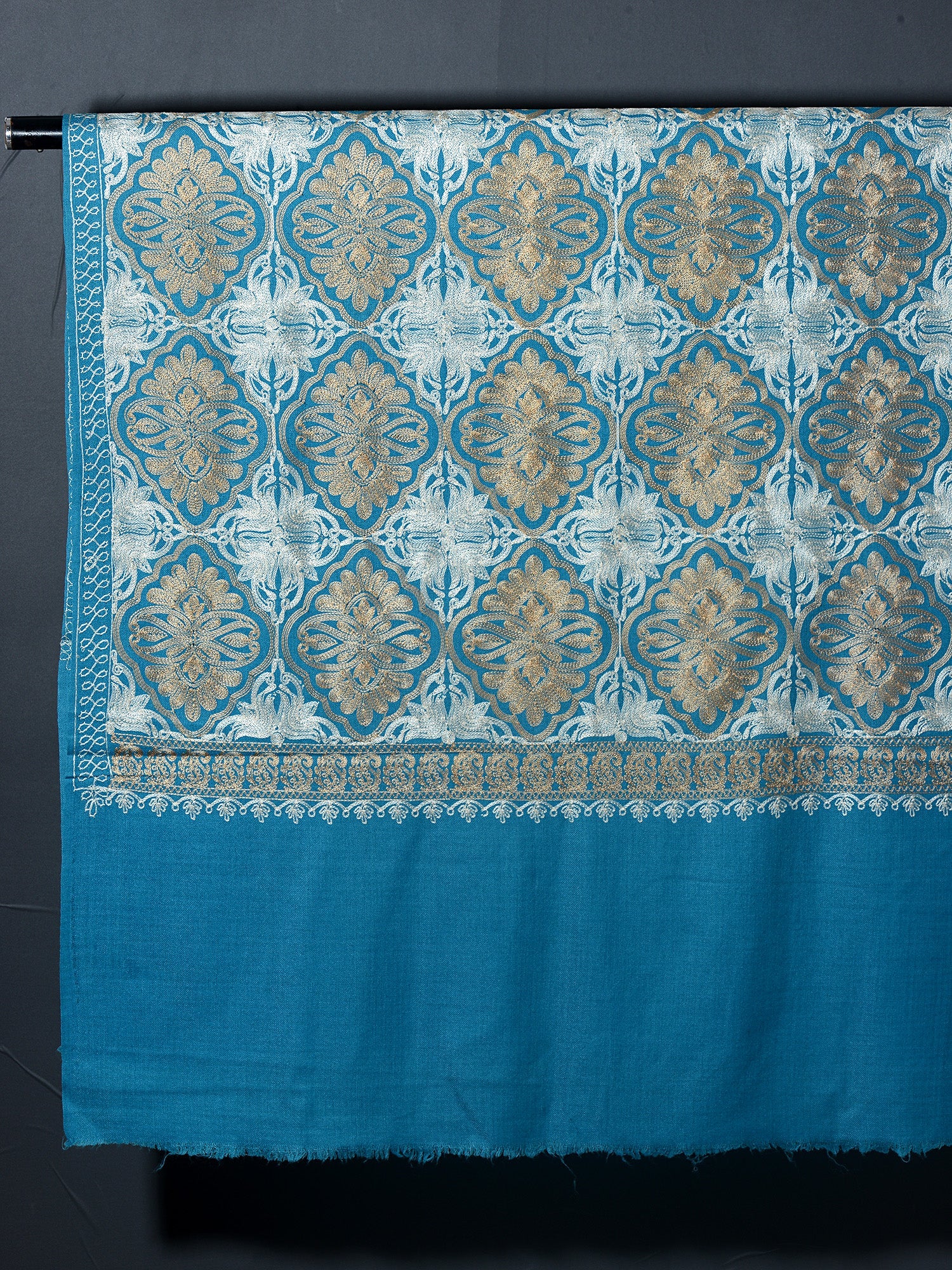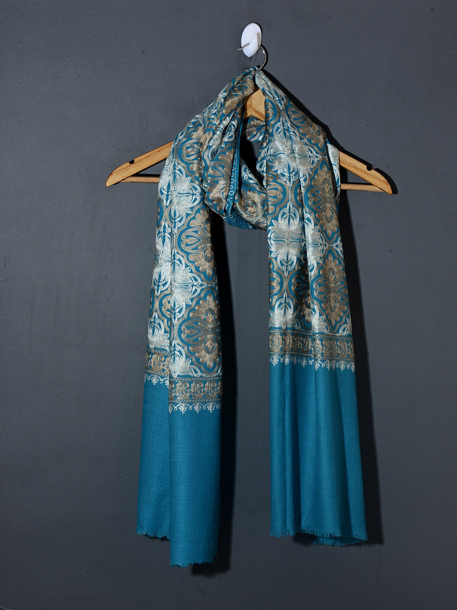 QUADIR means beautiful  and brave in Ocean Blue. It is an Elegant Embroidered shawl in Blue color both for men and women, with all over intricate embroidery using silk threads. The intricate pattern  makes the pashmina look very graceful and opulent.