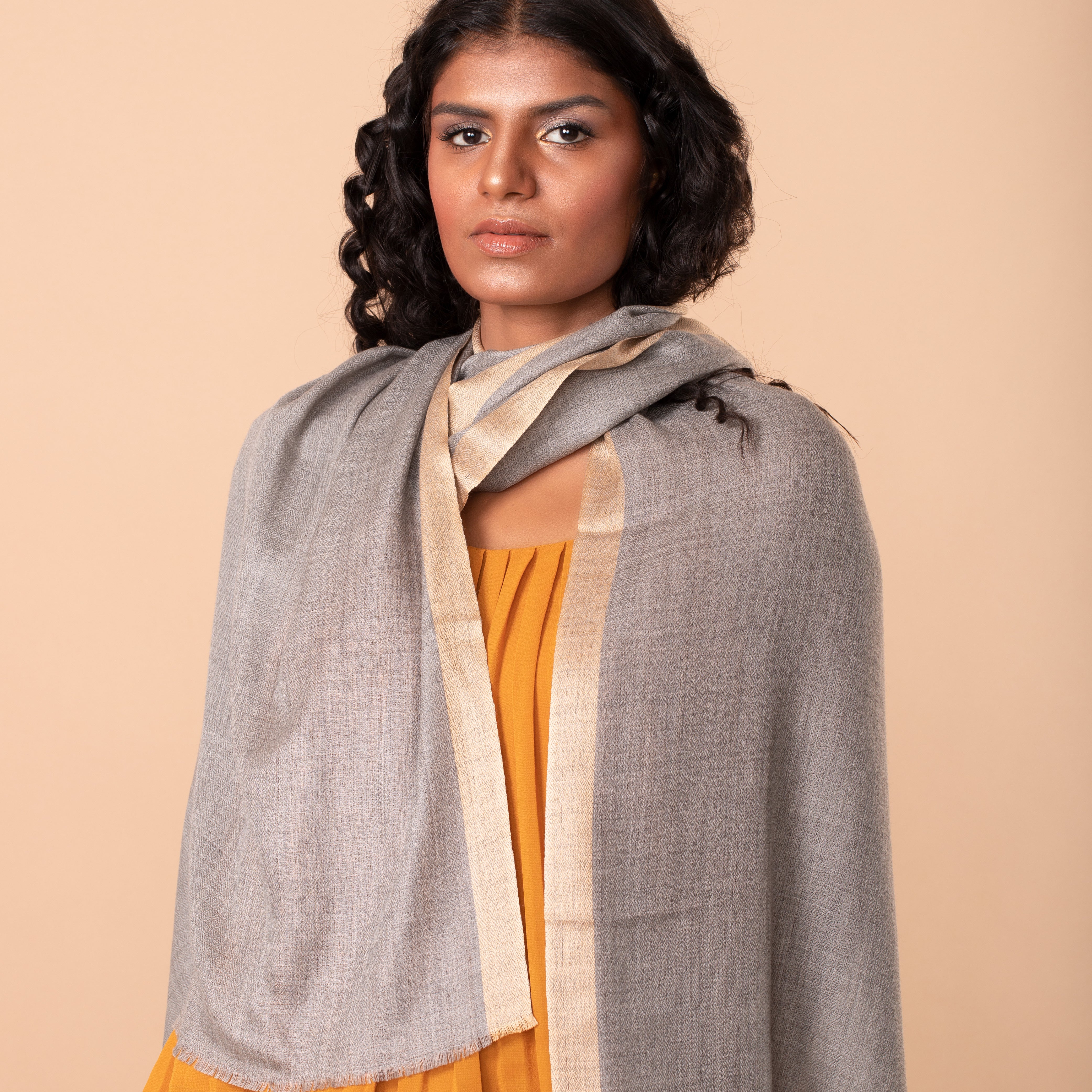 The versatility of these luxury Cashmere is unisex and can be worn in all seasons. Drape yourself in warmth with these modern weaves with a muted  color and a contrast border to add elegance and a classy look.