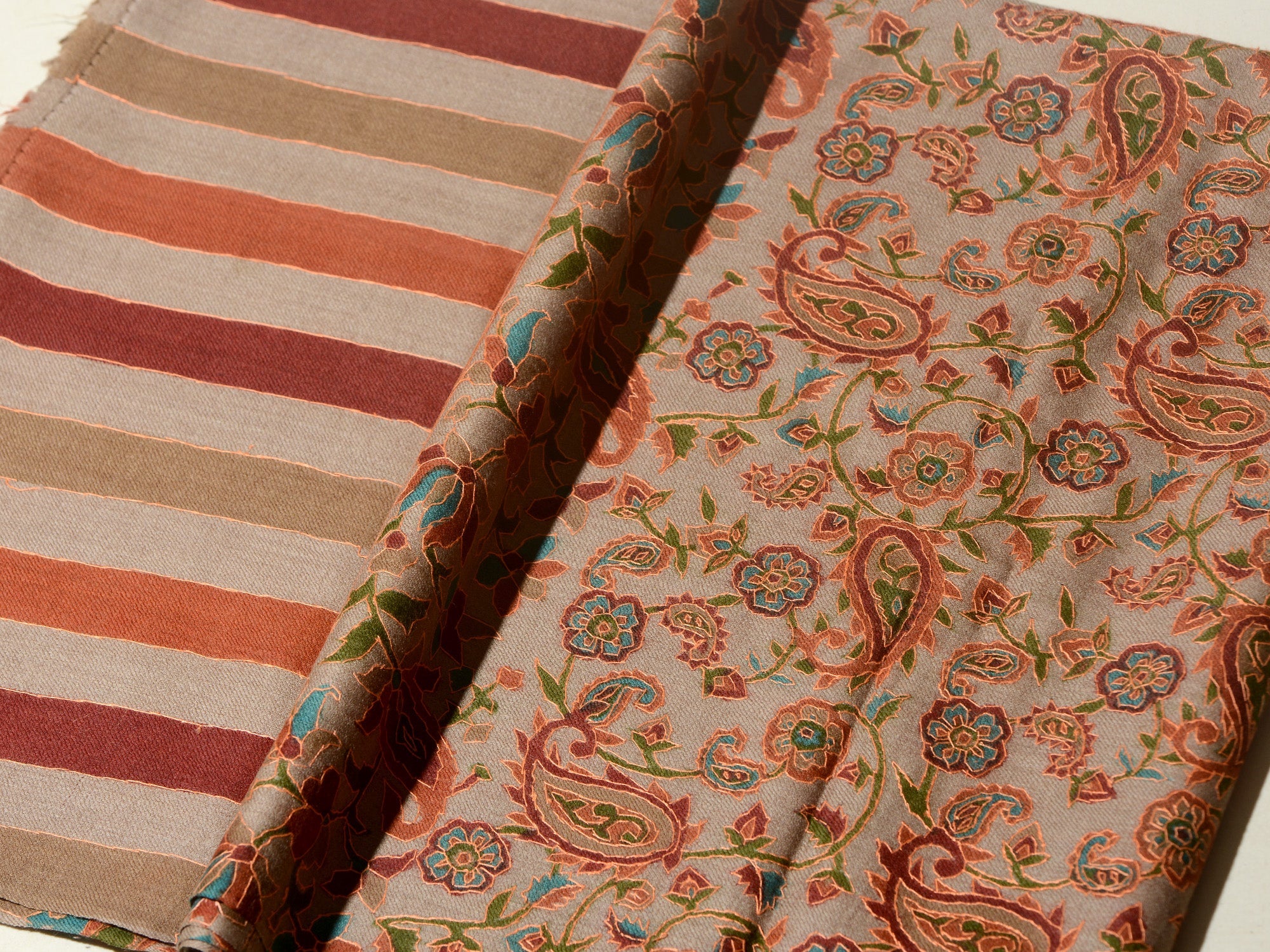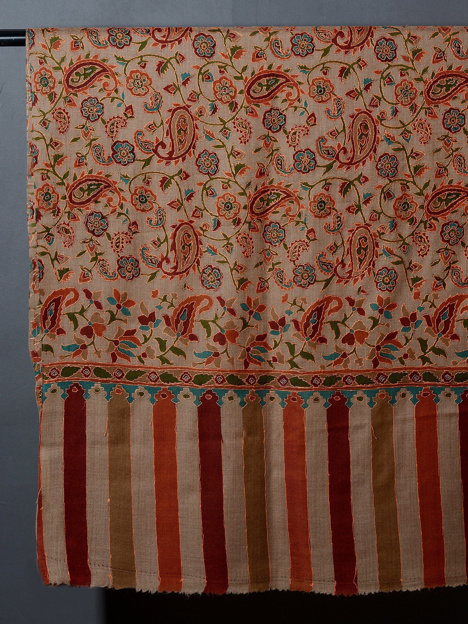 The traditional name for this variety of shawls is" Kani" and is very famous from the lands of Kashmir. Kani is generally an array of beautiful patterns woven using bright colors with a multi colored striped edges. This particular shawl is made in wool, but is not hand woven. It is machine woven to give the Kani look. The original Kani is much more lighter, softer to feel and more luxurious.