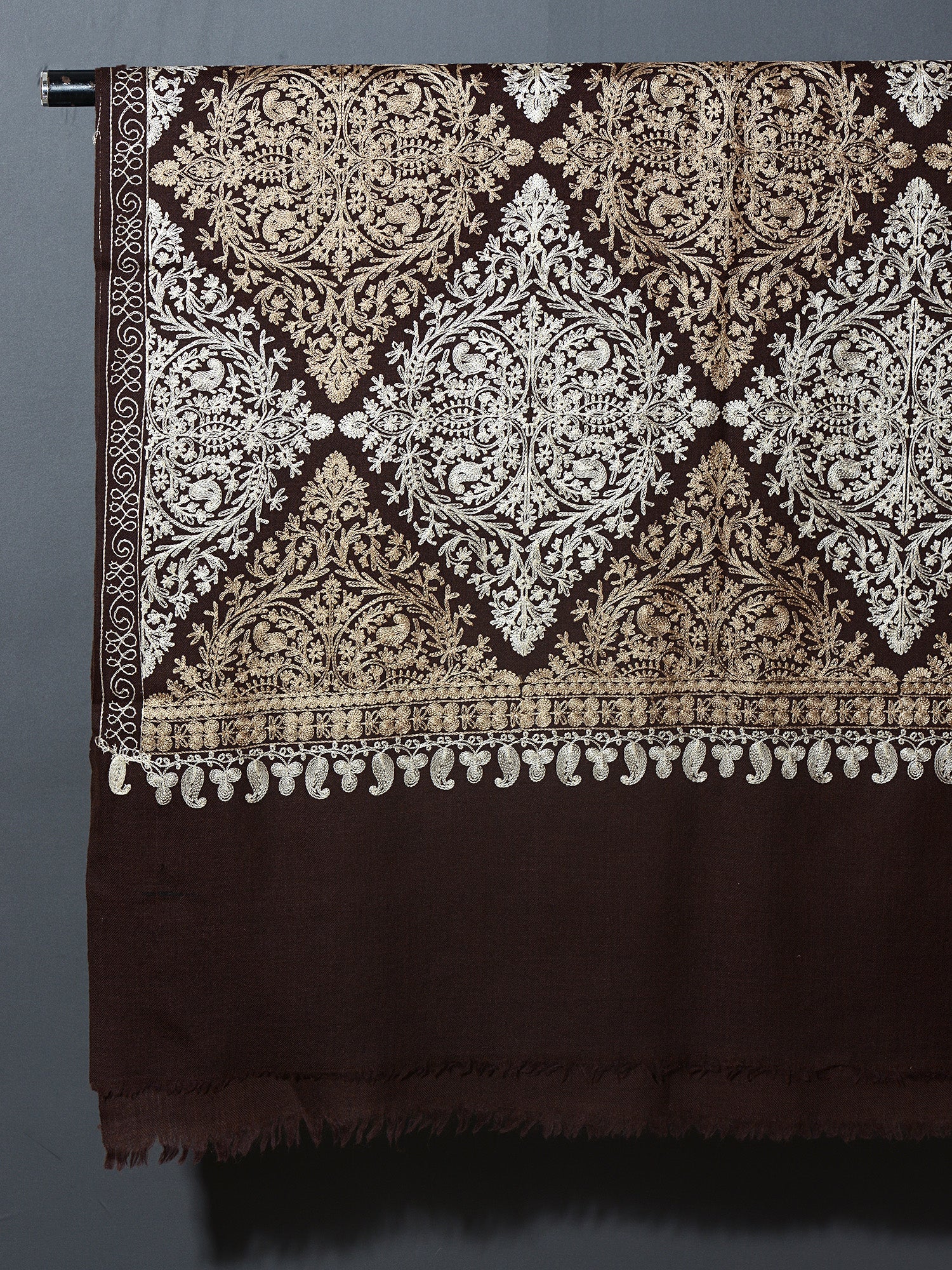 TAANISH means good, wonderful and nice. It is an Elegant Brown Embroidered shawl, both for men and women, with all over intricate embroidery using silk threads. The intricate pattern makes the pashmina look very graceful and opulent.