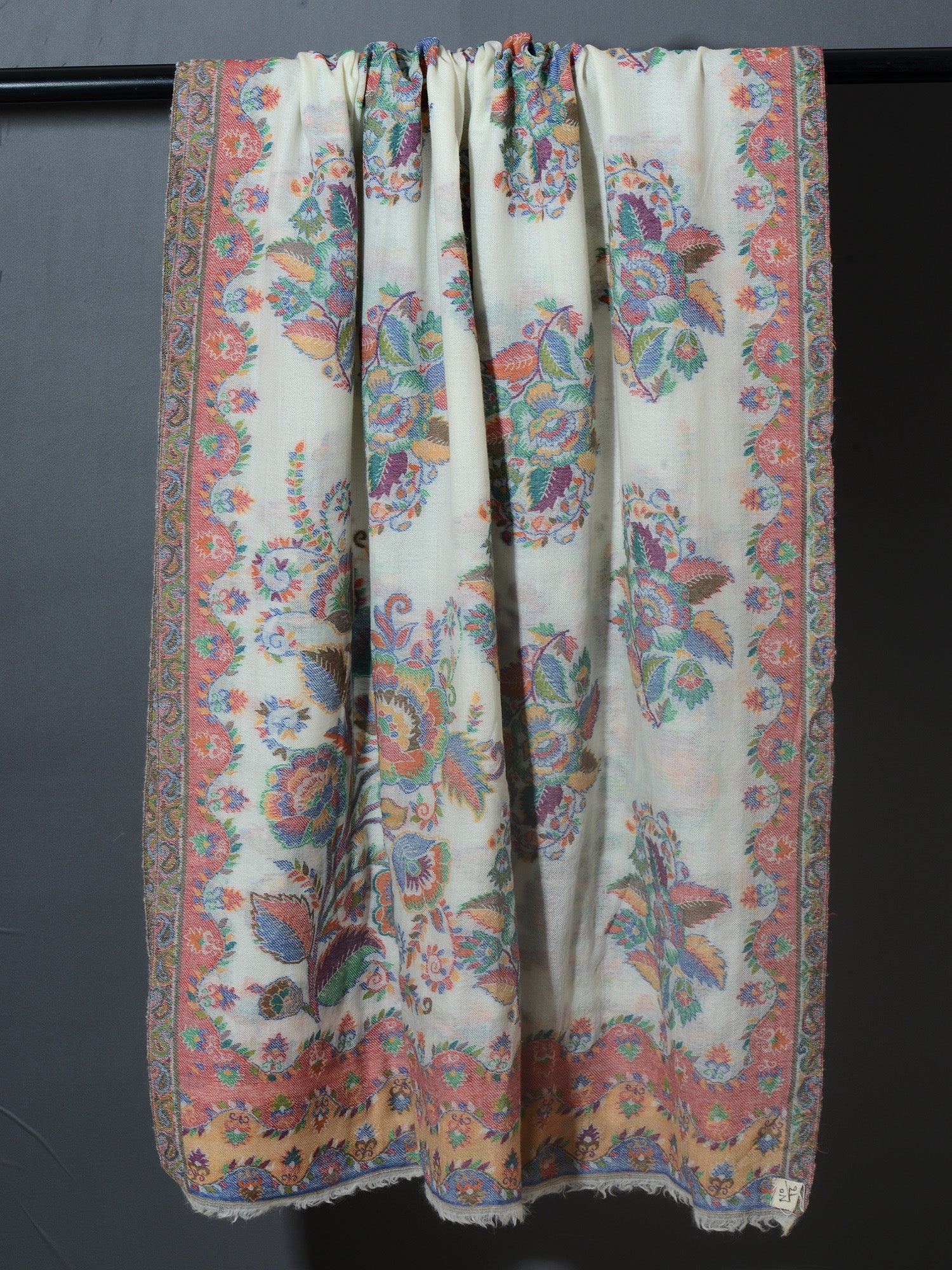 The traditional name for this variety of shawls is" Kani" and is very famous from the lands of Kashmir. Kani is generally an array of beautiful patterns woven using bright colors with a multi colored striped edges. This particular shawl is made in wool, but is not hand woven. It is machine woven to give the Kani look. The original Kani is much more lighter, softer to feel and more luxurious.