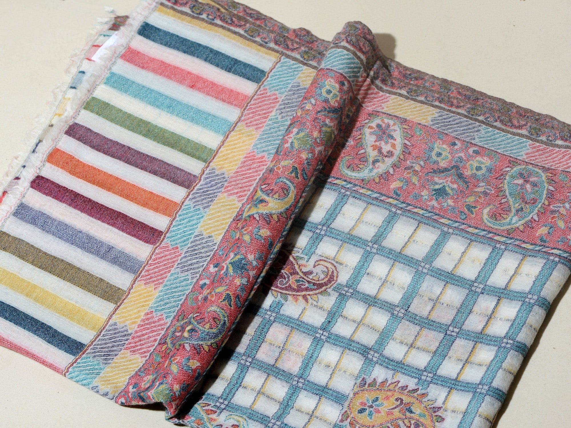 The traditional name for this variety of shawls is" Kani" and is very famous from the lands of Kashmir. Kani is generally an array of beautiful patterns woven using bright colors with a multi colored striped edges. This particular shawl is made in wool, but is not hand woven. It is machine woven to give the Kani look. The original Kani is much more lighter, softer to feel and more luxurious.