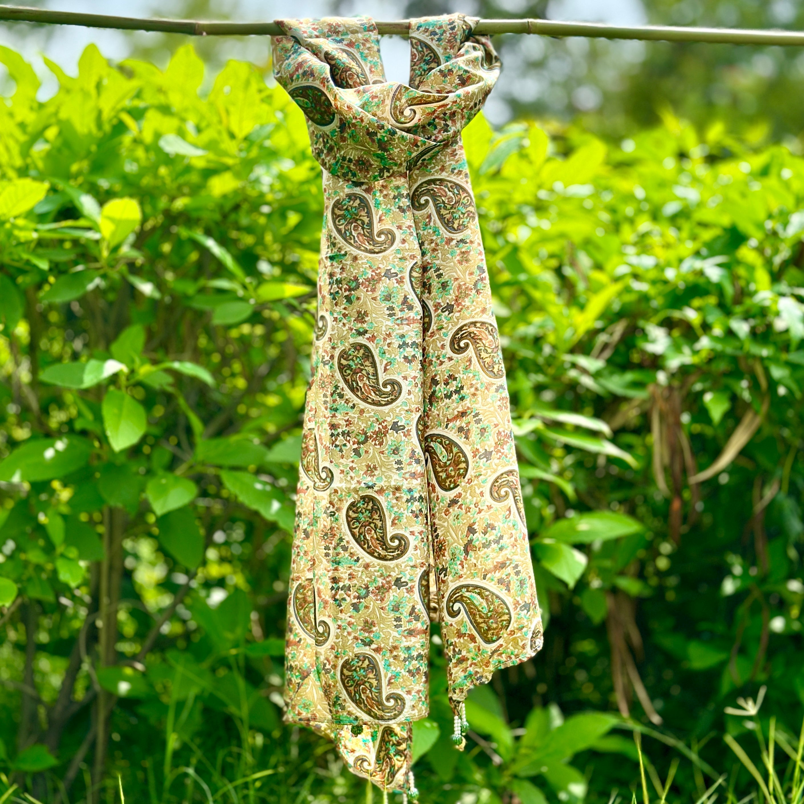 This pretty silk scarf has a beautiful paisley pattern with minute details and pearl tassels. It is a elegant piece to brighten up your wardrobe. The multi green print on a natural base gives it an elegant look that is sure to get noticed in any crowd.