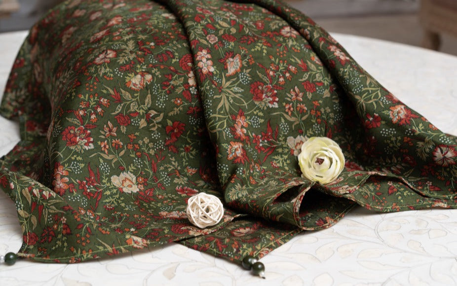 OMVAI’s Victorian Floral Print Silk Scarf is inspired by the Victorian floral patterns with intricate detailing in design elements. This pretty silk scarf has a beautiful floral pattern in modern designs and color palette with glass bead tassels. It is a elegant piece to brighten up your wardrobe. The multi color print on a emerald green base gives it an elegant look that is sure to get noticed in any crowd.