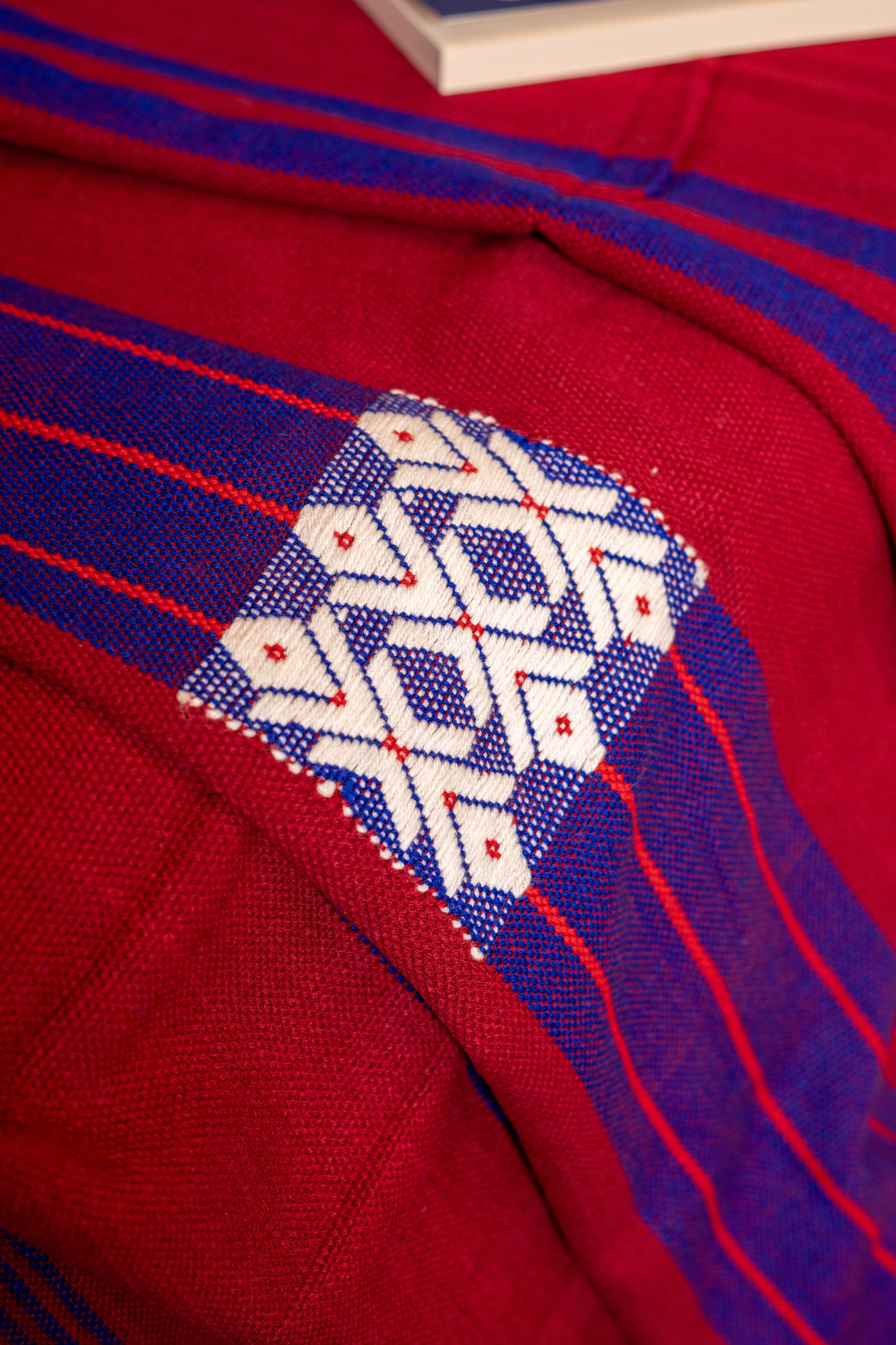 OMVAI Artisanal Patterned Cashmilon Woven Throw Blanket / Comforter Burgandy with Blue, and White weave border