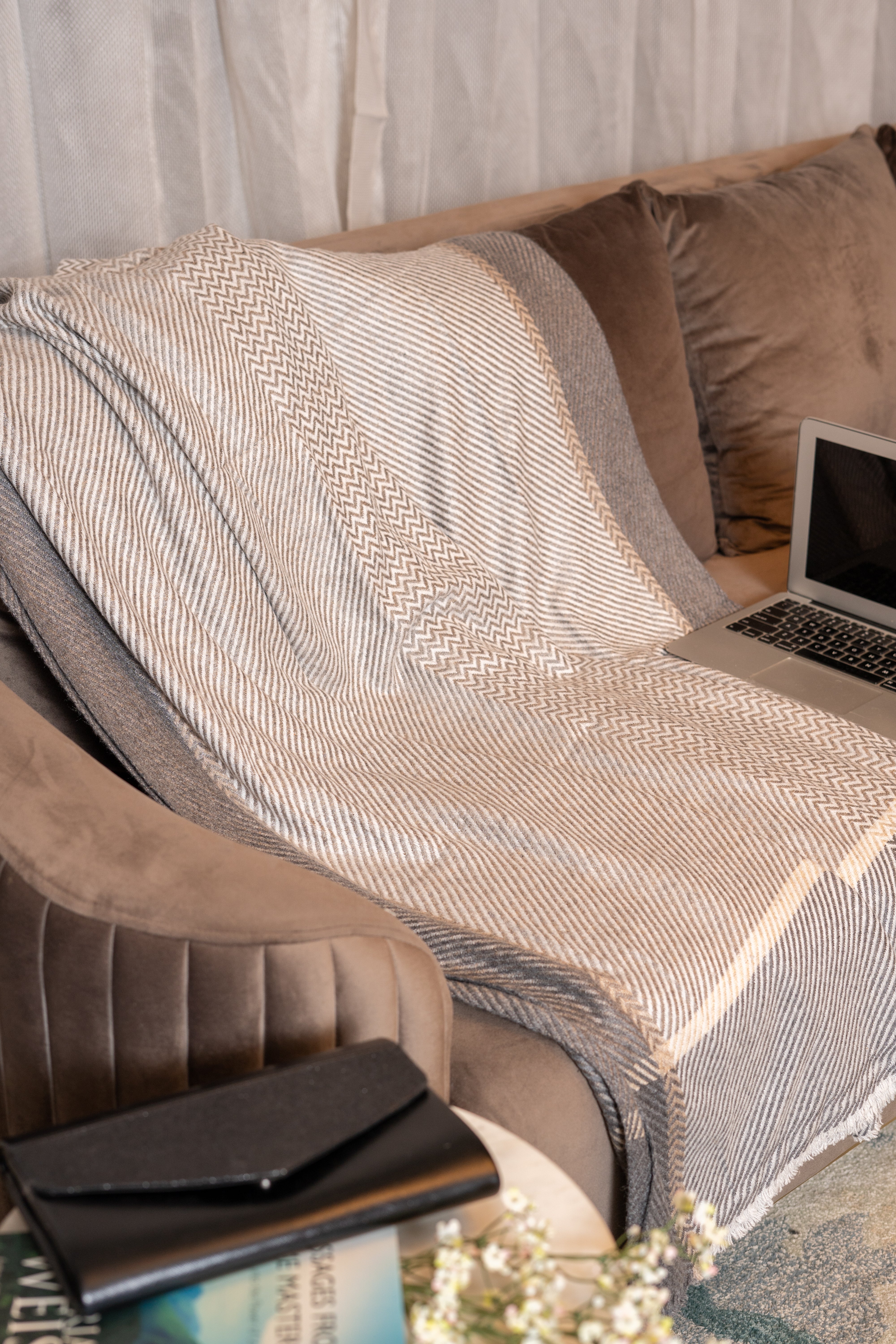 OMVAI Regal Patterned Woven Throw Blanket / Comforter with Border - Beige with Charcoal grey