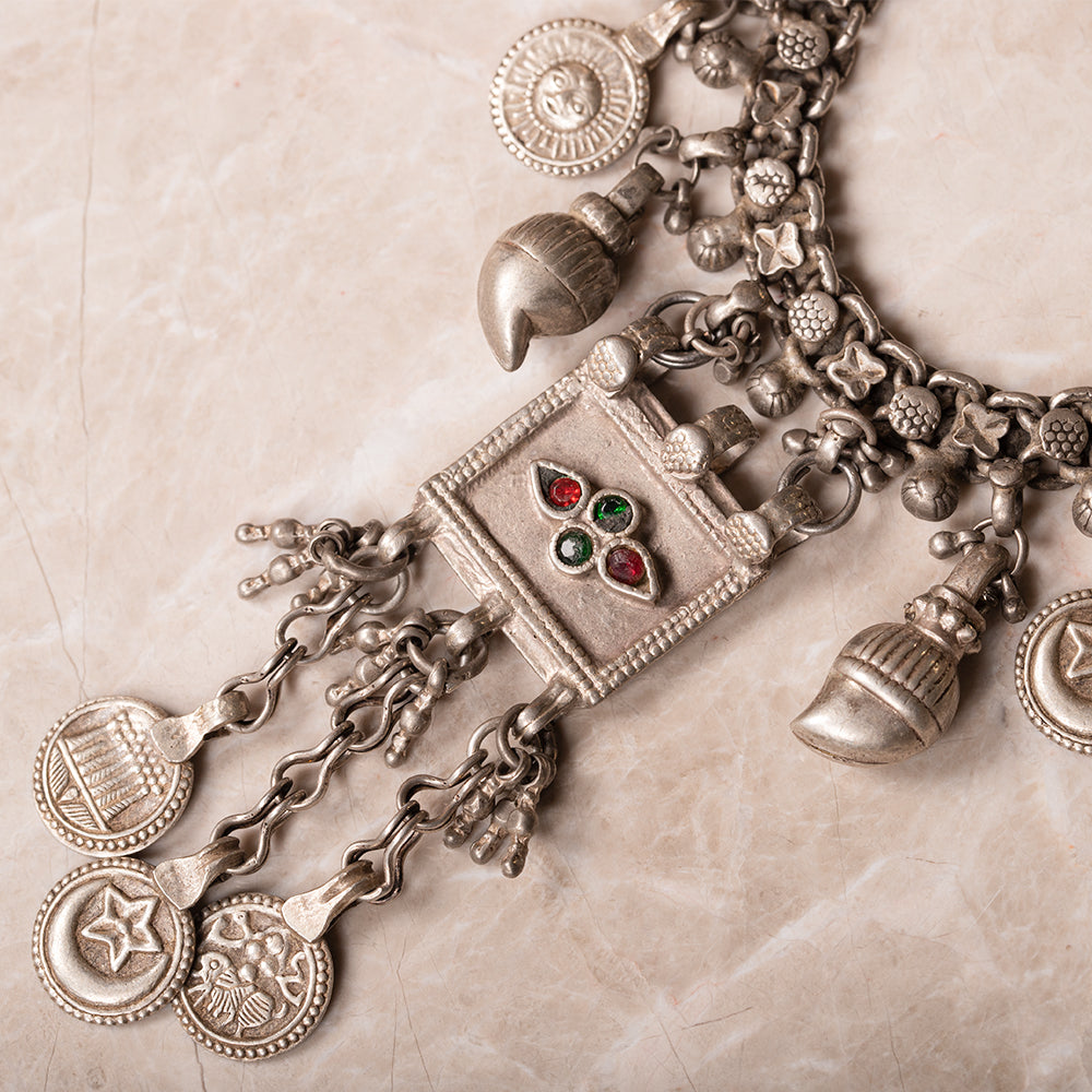 A traditional necklace with a vintage look which can be adorned with any kid of attire or color. A touch of ethic look, a touch of contemporary style and a touch of class and elegance is what this necklace is all about. It is light weight with a red string tie up with a beautiful choker design